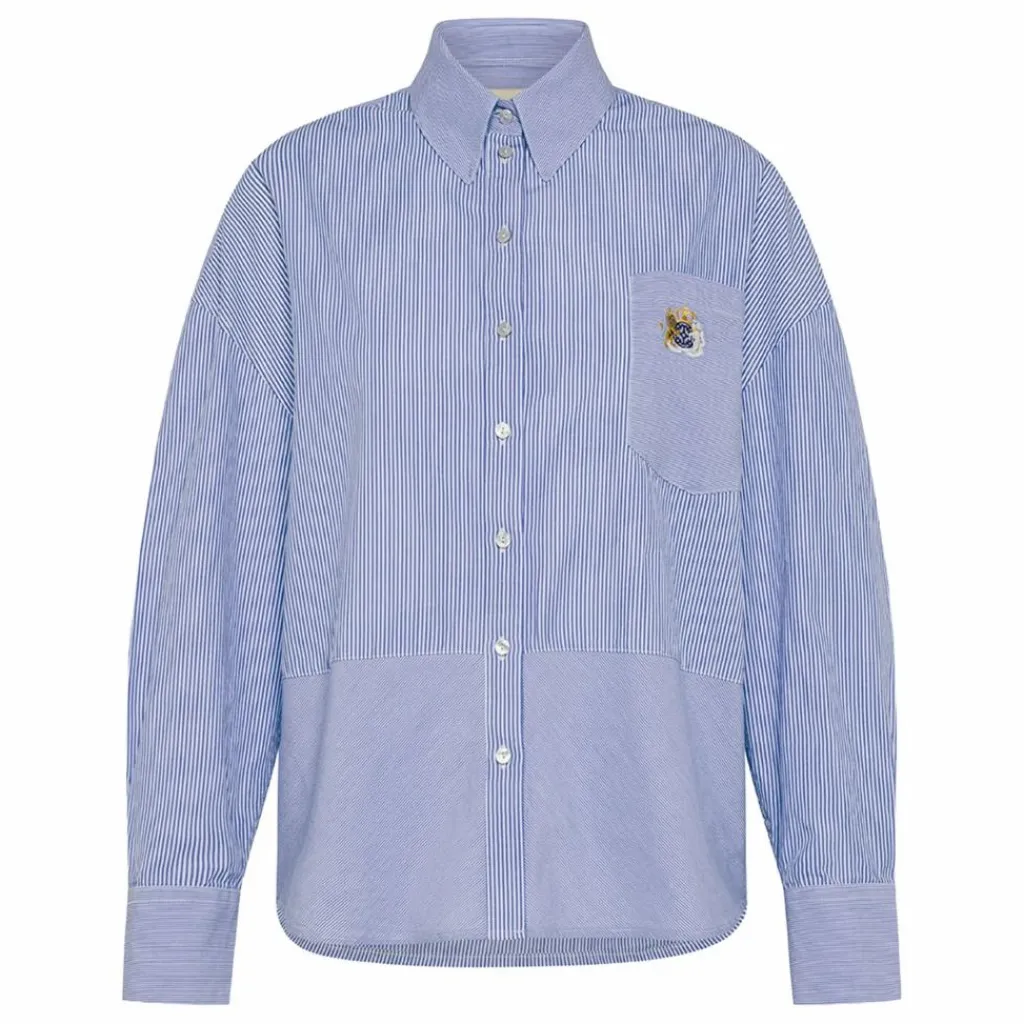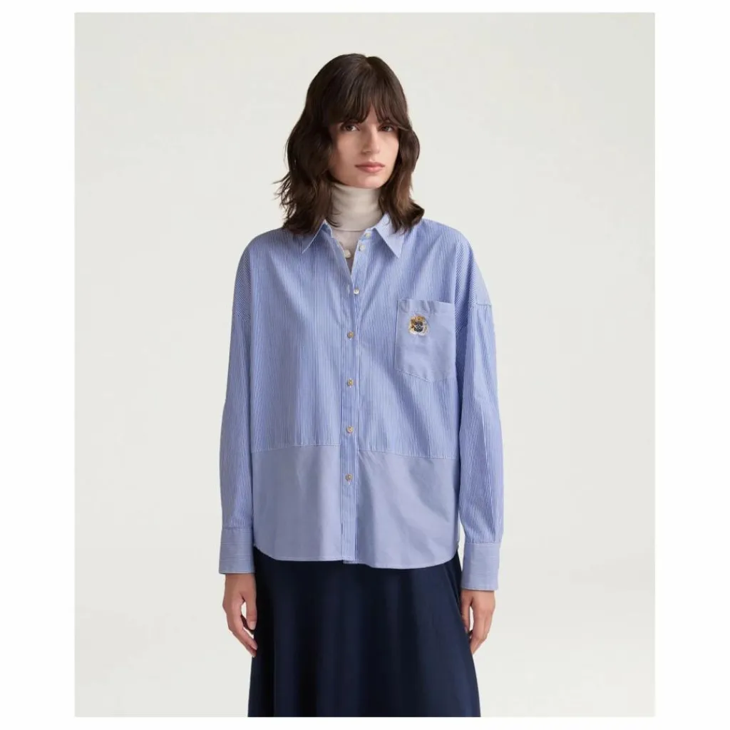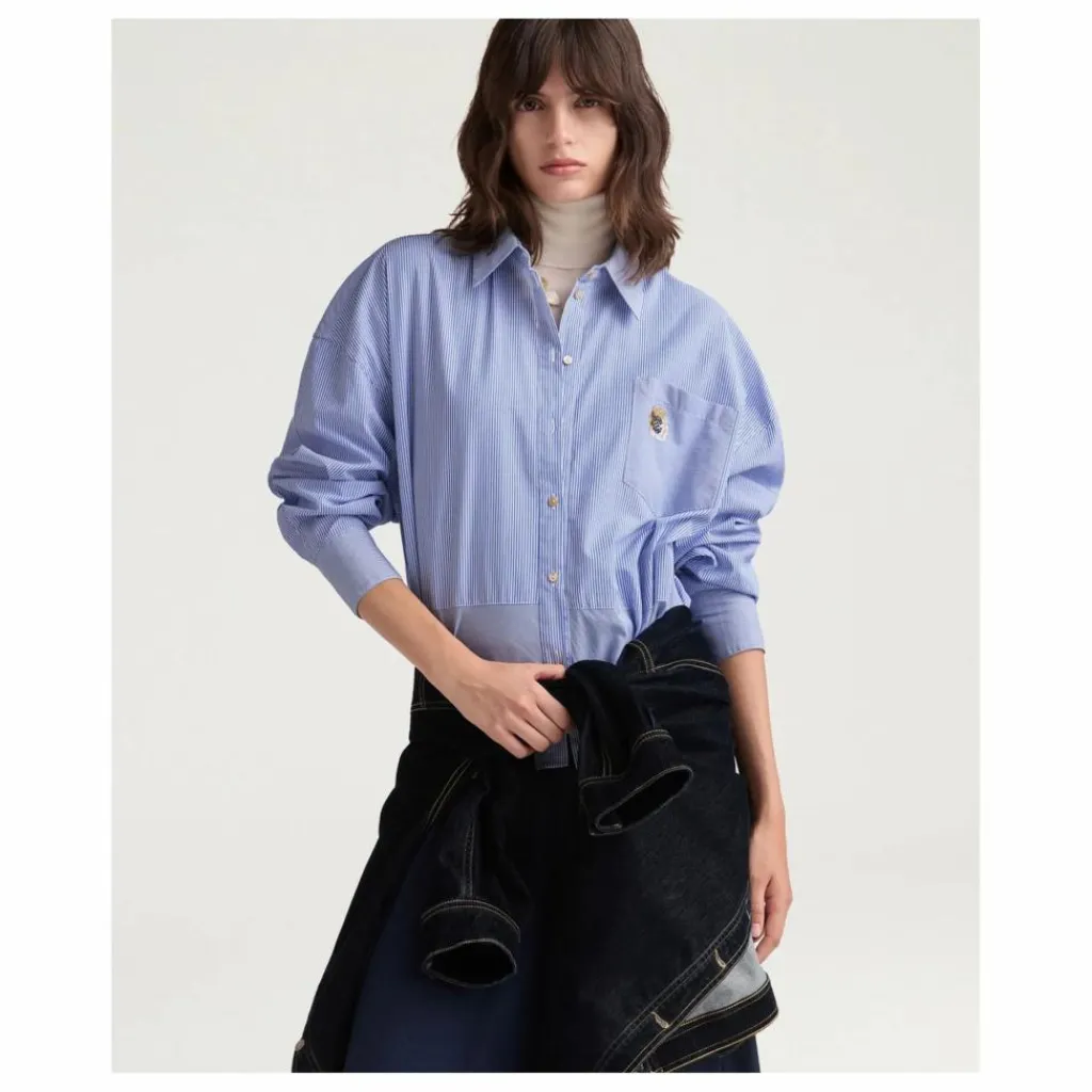 - Chemise mix & match à col rond en deux popelines de coton frottées. Le jeu créé par les rayures est enrichi par la nouvelle broderie héraldique Momoni sur la poche poitrine, col voile, poignets masculins et boutons en nacre.