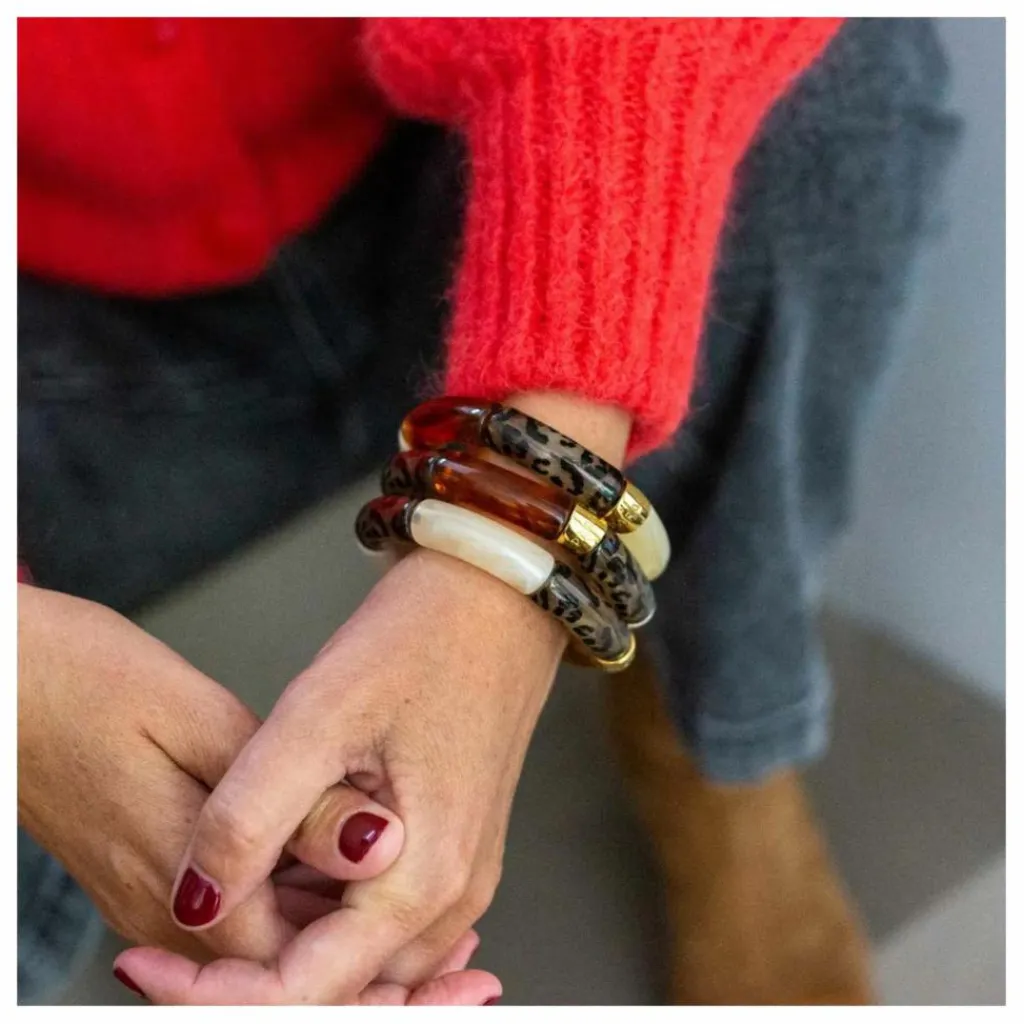 - Bracelet composé de perles acryliques ou résine et d’une perle en acier au logo de la marque PARABAYA