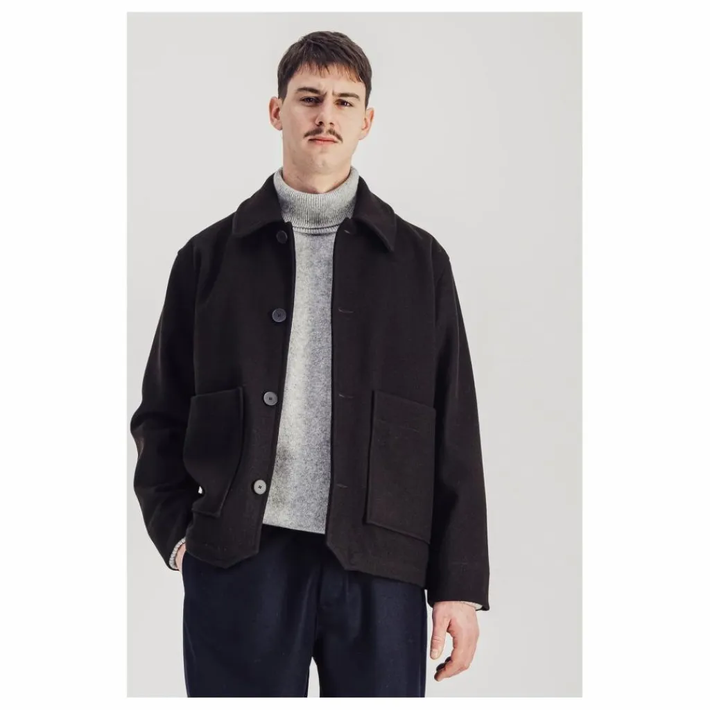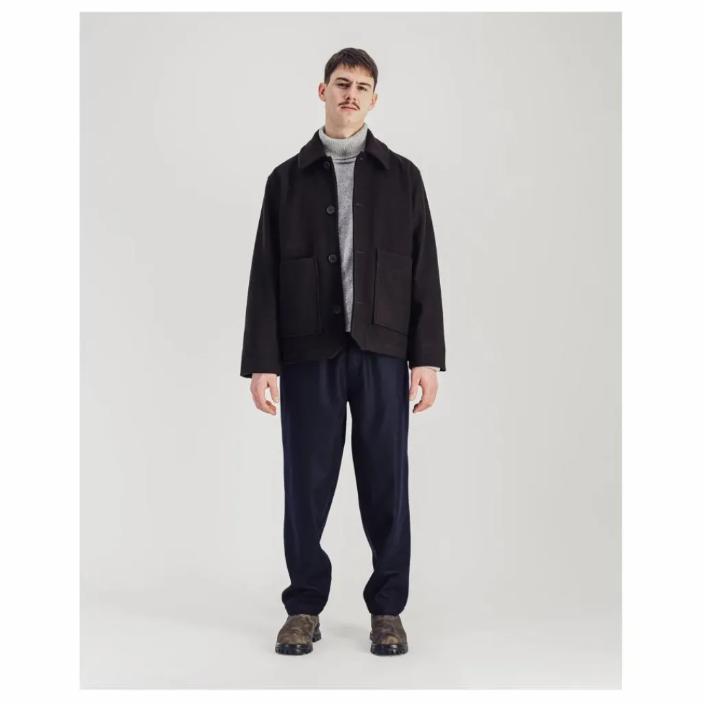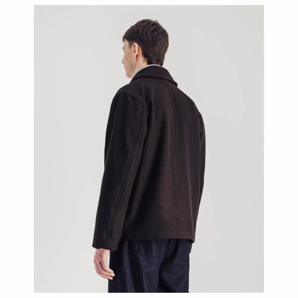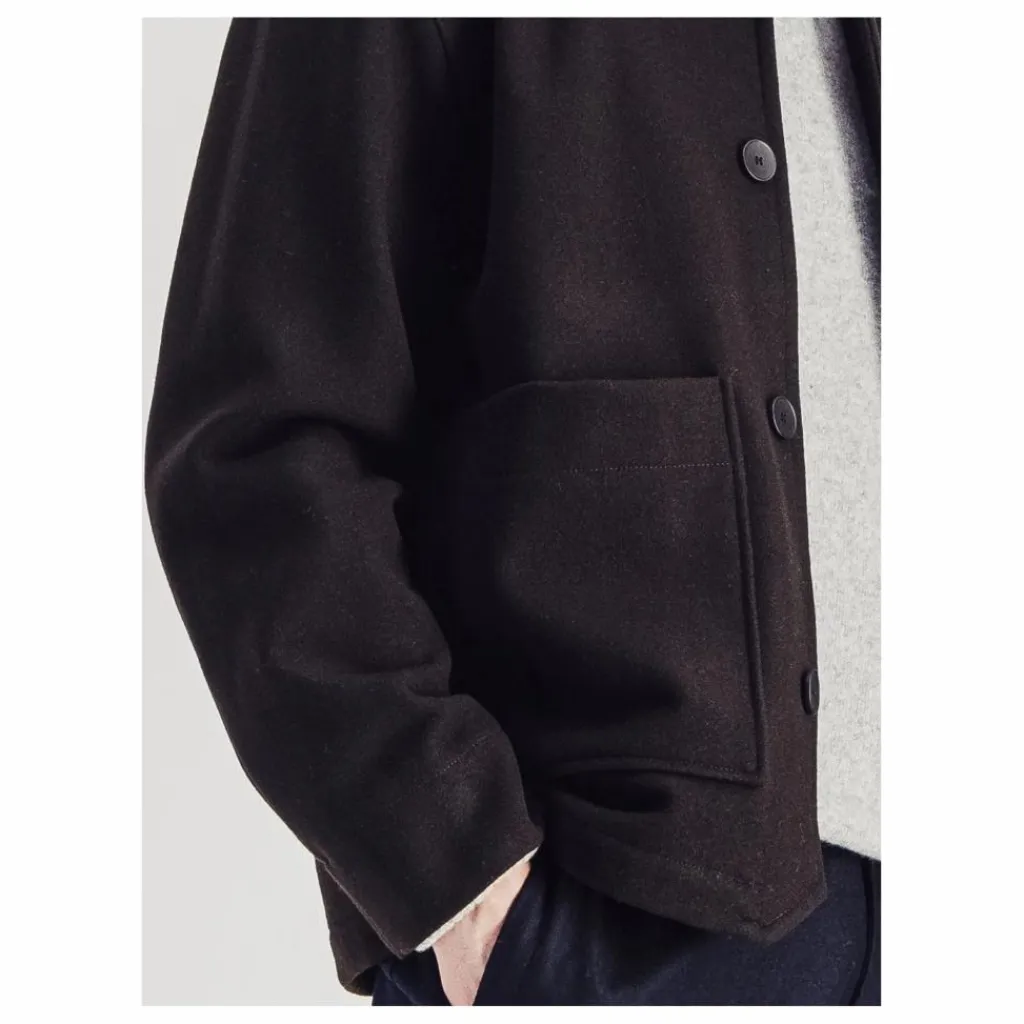 - Veste de style minimaliste en drap de laine épais, avec deux poches plaquées sur le devant et entièrement doublée en popeline de coton.