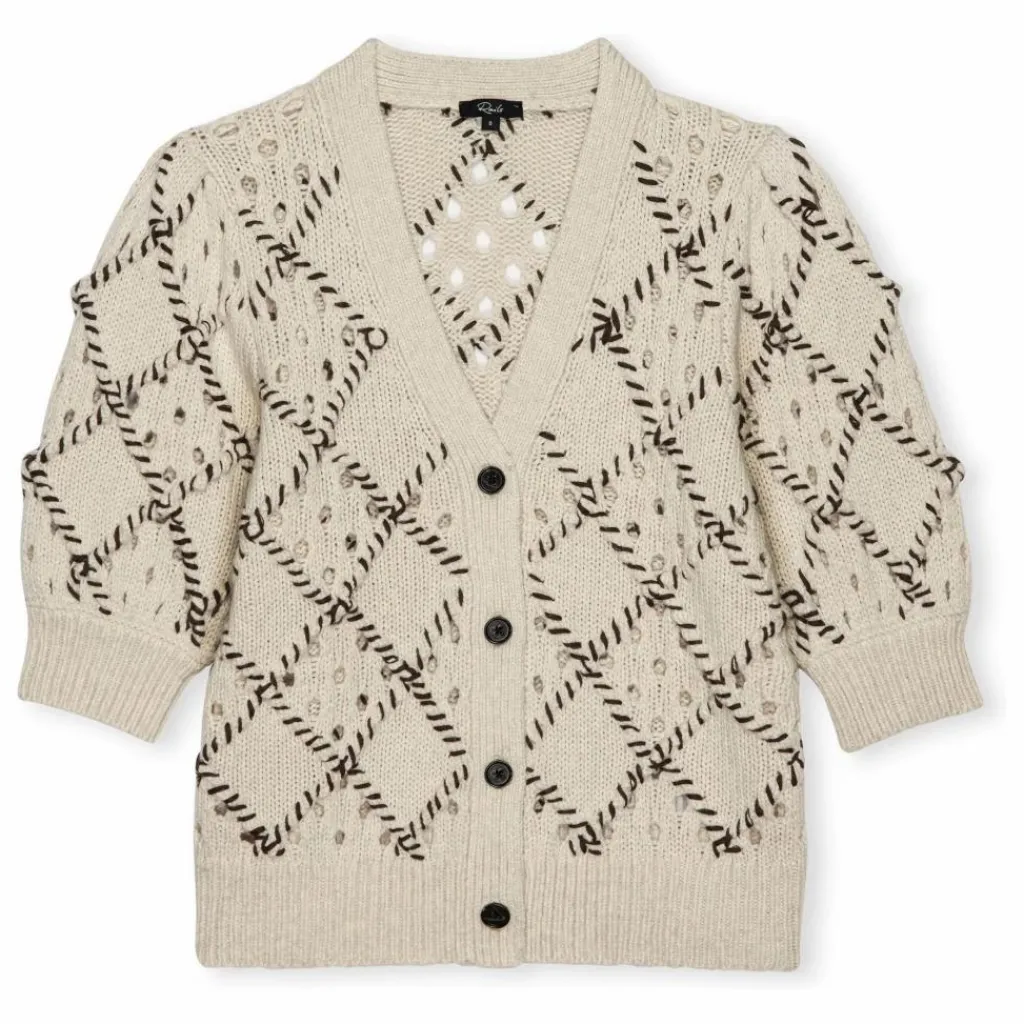 - Un cardigan à manches courtes qui ne passe pas inaperçu. Le Isla est réalisé en laine mélangée pour un confort douillet, avec une texture argyle, des boutons en cuir tressé et une rayure pico. Féminin et raffiné, il rehausse sans effort n’importe quelle tenue.