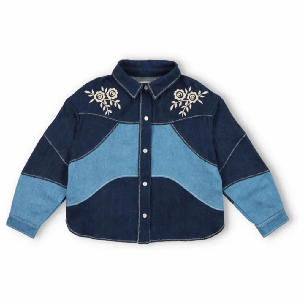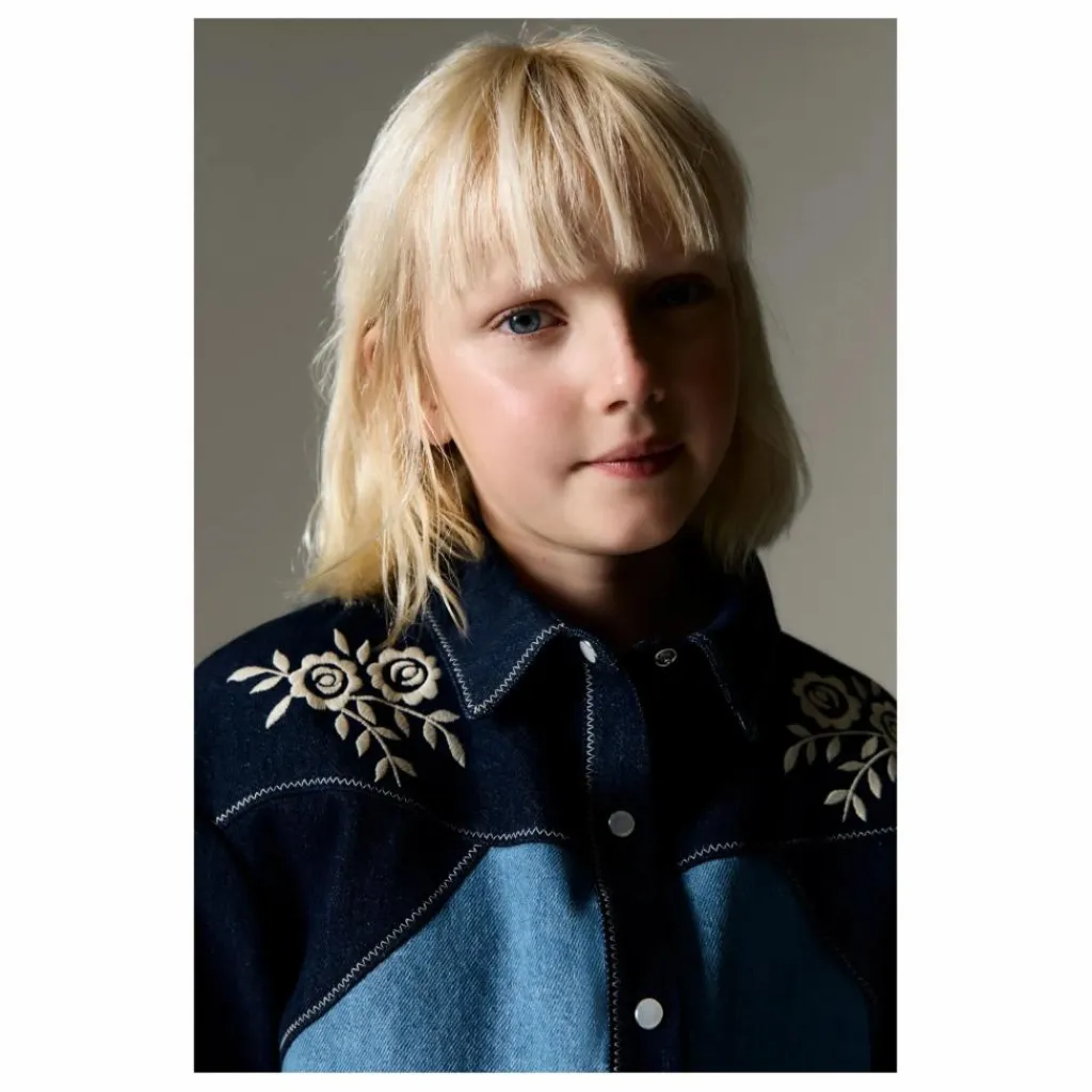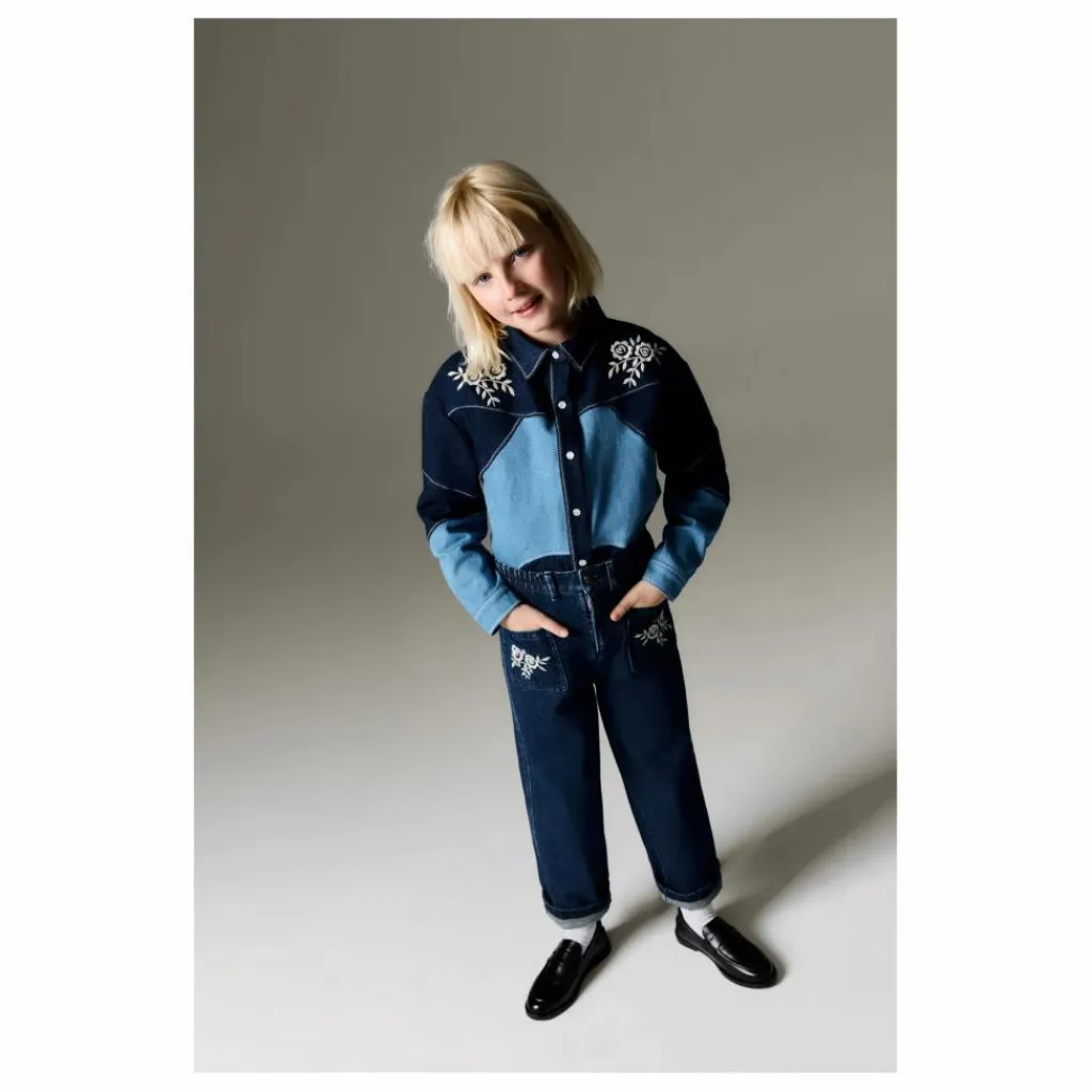 - Chemise en denim Danubio bicolore 100% coton. La chemise se distingue par sa broderie de fleurs et de feuilles, combinant le denim et les points zigzag.