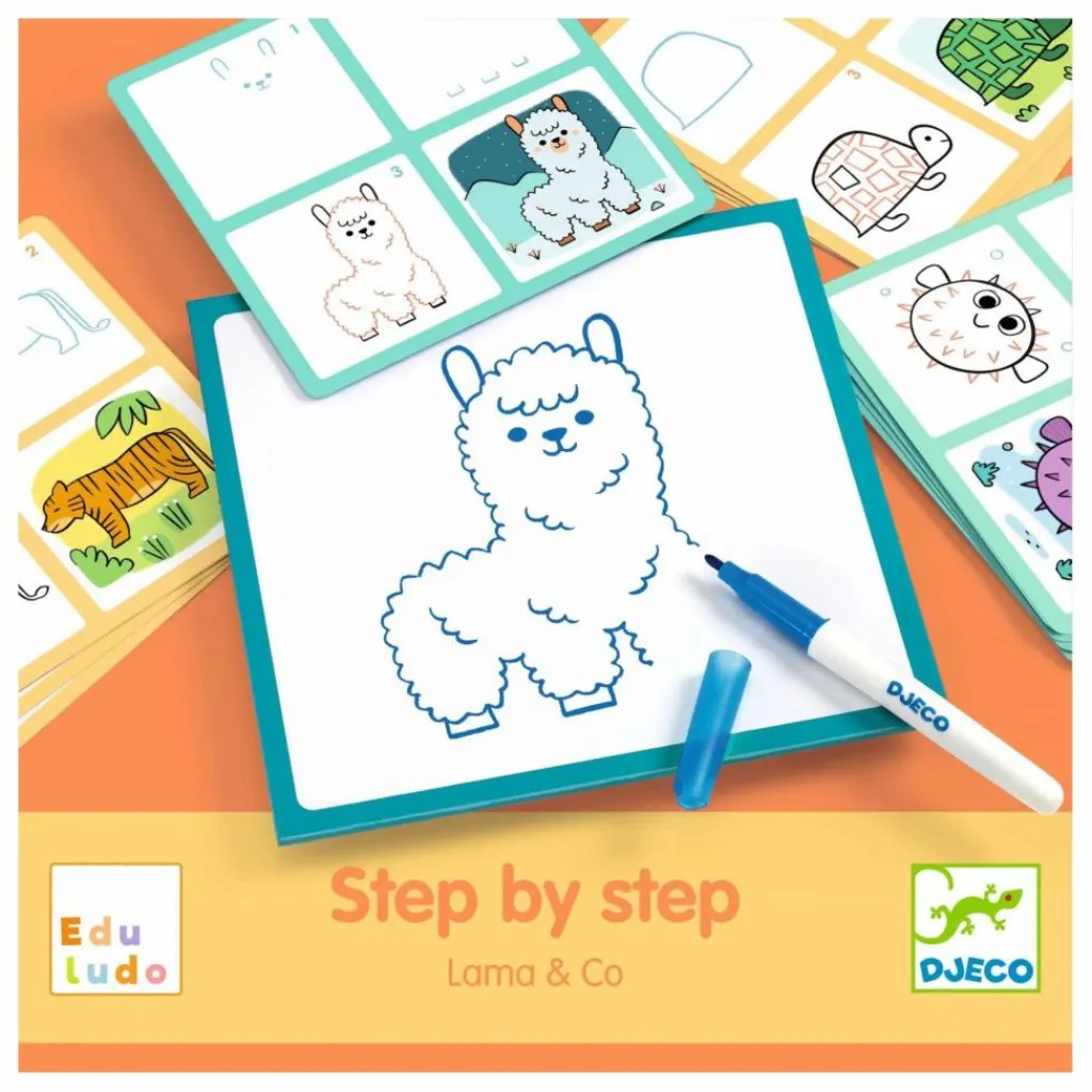 - Apprendre à dessiner en suivant le pas-à-pas. Des cartes « modèle » pour guider l’enfant. Il recommence autant de fois qu’il le souhaite avec le feutre effaçable. Une première approche ludique et facile des premiers graphismes (boucles, ponts, etc.).