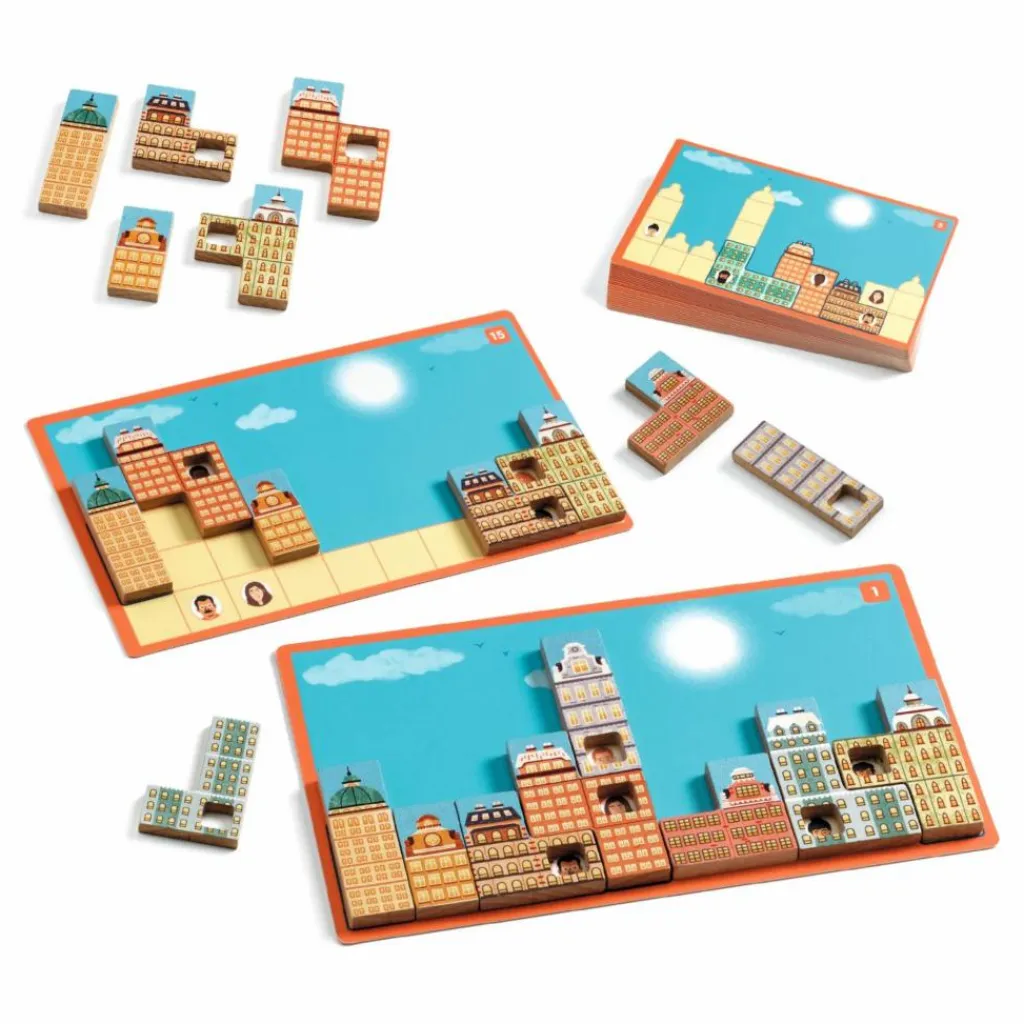 Vous voici architecte ! Reconstruisez les gratte-ciels d’une grande ville. Mais attention de ne pas boucher la vue des habitants ! Chaque défi demande de placer 8 pièces parmi les 10, recto ou verso, à l’horizontale ou à la verticale.