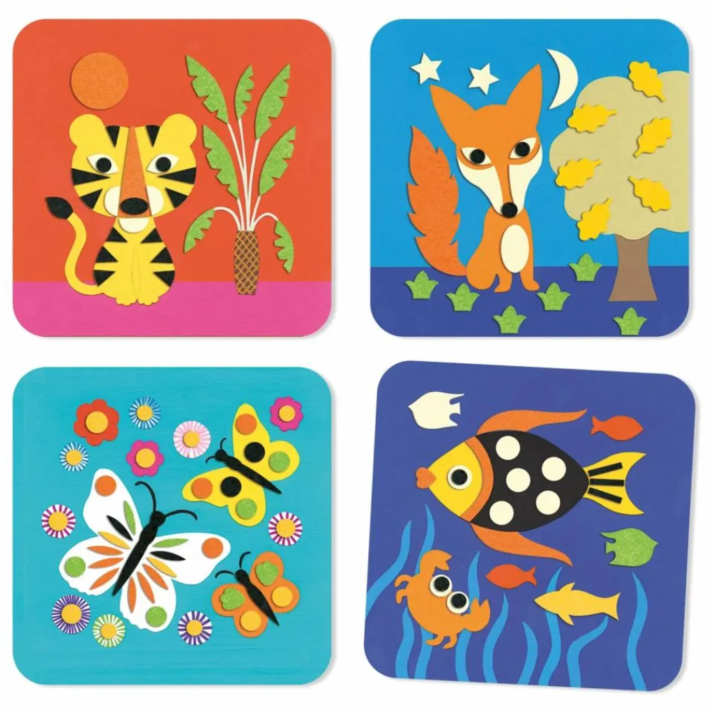 - Une activité de collage pour réaliser 4 tableaux avec des gommettes toutes douces en feutrine. En suivant le livret explicatif, l’enfant assemble et superpose les gommettes de feutrine pour composer 4 tableaux « animaux » doux et colorés.