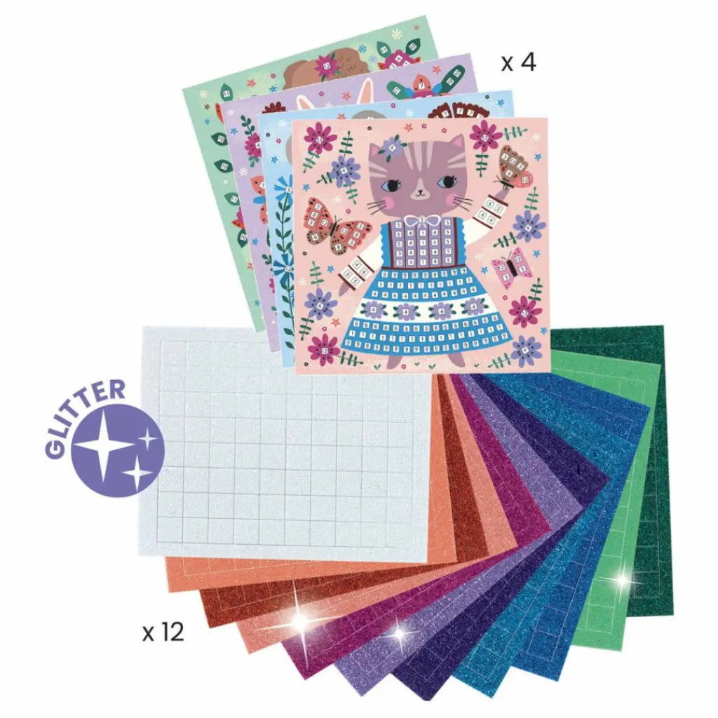 Un coffret pour s’initier à l’art de la mosaïque en décorant les tenues de ces adorables personnages. 4 tableaux à compléter avec de petits carrés de mousse pailletée qui s’utilisent comme des stickers. Votre enfant repère les numéros puis colle les pièces correspondantes à l’emplacement désigné sur la planche.