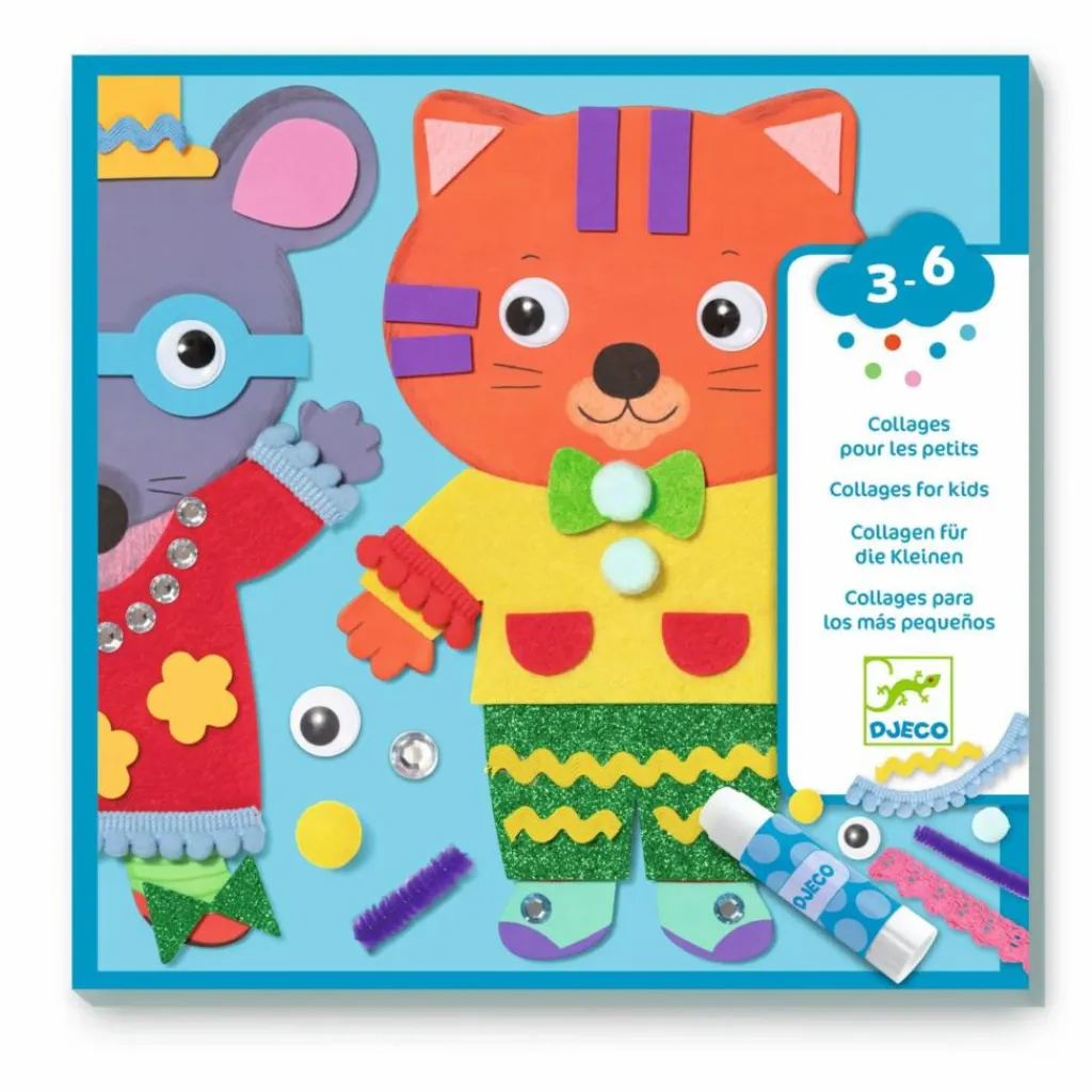 Un coffret de collage tout inclus pour décorer 4 personnages silhouettés avec une multitude d’éléments aux textures variées (feutrine, mousse, sequins, rubans, pompons, yeux mobiles). L’enfant choisit un tableau et colle les éléments pour le compléter. Plein de matières différentes à coller sur des silhouettes en carton épais. Et un résultat trop chou !