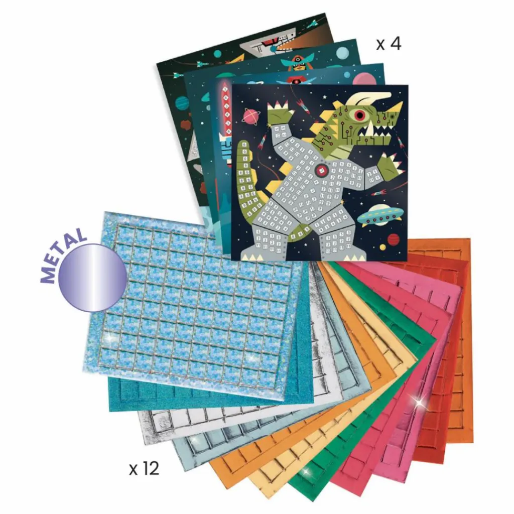Un coffret pour s’initier à l’art de la mosaïque, où les robots affrontent de terribles monstres. 4 tableaux à compléter avec de petits carrés de mousse métallisée qui s’utilisent comme des stickers. Votre enfant repère les numéros puis colle les pièces correspondantes à l’emplacement désigné sur la planche. Les tableaux se remplissent et les personnages prennent vie.