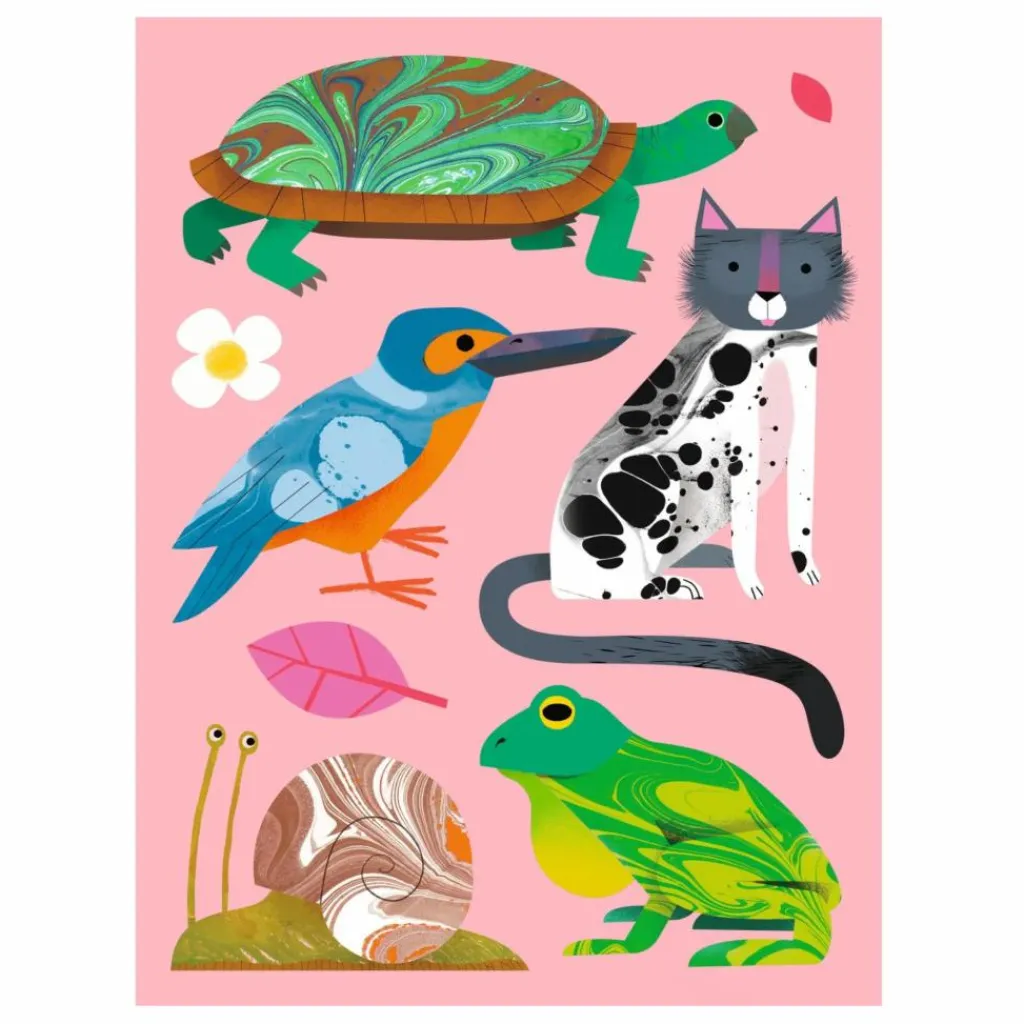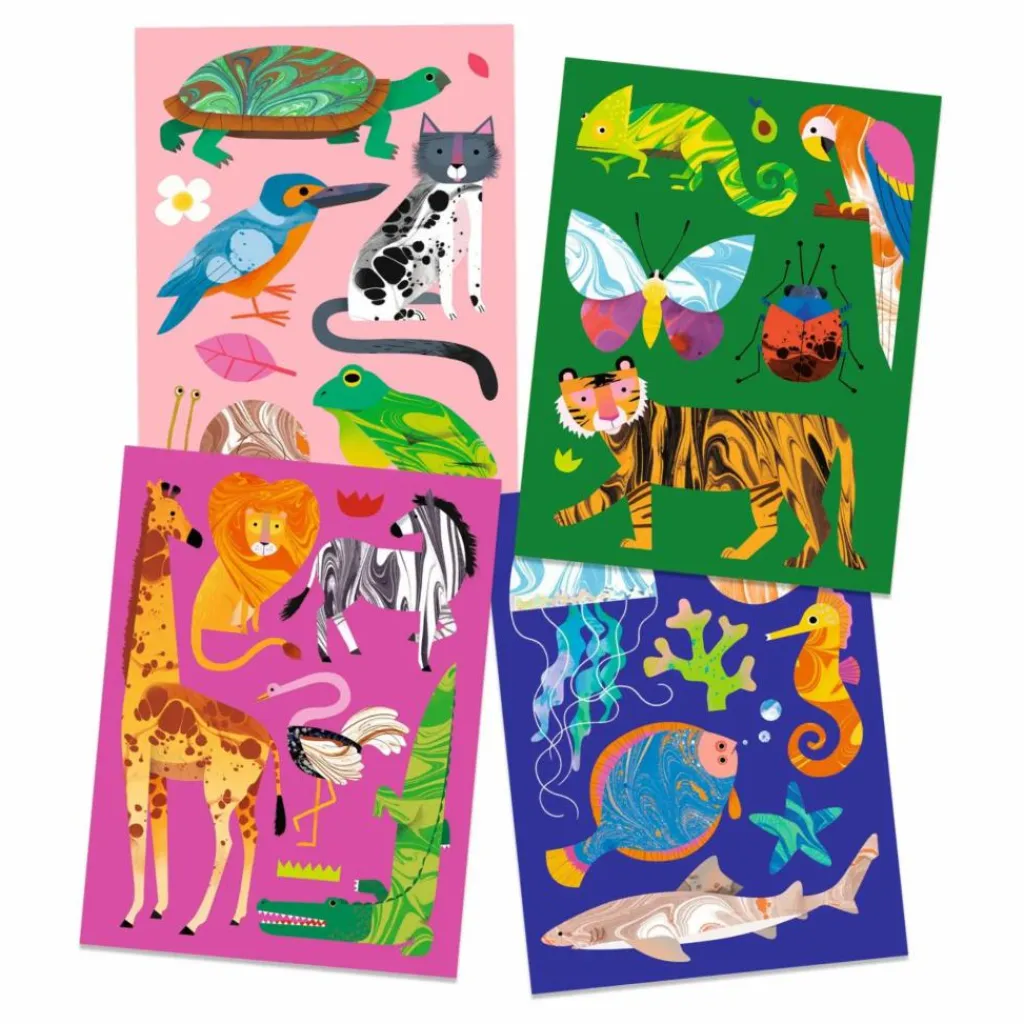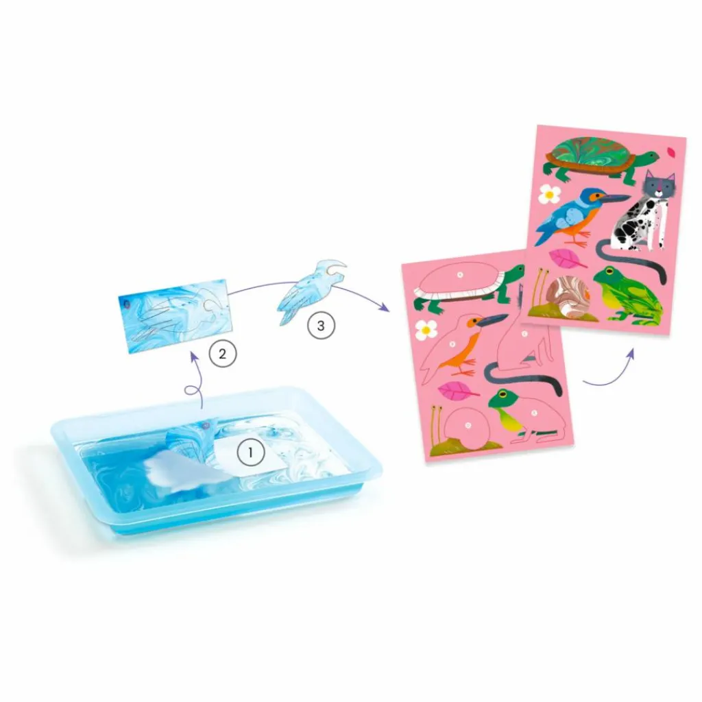 « Colorful » est une activité pour apprendre à marbrer le papier avec des encres colorées. Votre enfant complète les animaux des 4 tableaux avec des stickers qu’il a lui-même « imprimés ». Il verse les encres goutte à goutte puis les mélange : les couleurs s’entrelacent sans se brouiller. Il dépose ensuite les autocollants à la surface du bain pour transférer les motifs sur le papier. Les motifs créés se transfèrent sur le papier comme par magie !