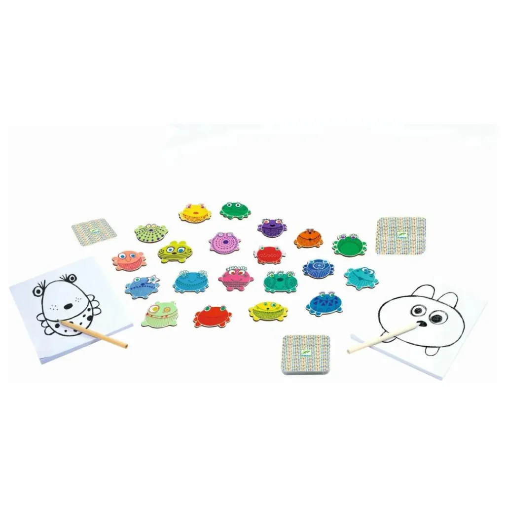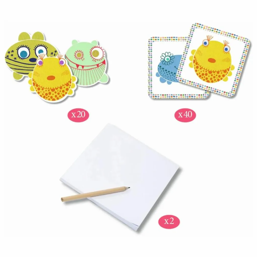 - 20 insectes, 40 cartes, 2 blocs de dessin, 2 crayons. 1 règle du jeu en 10 langues.
