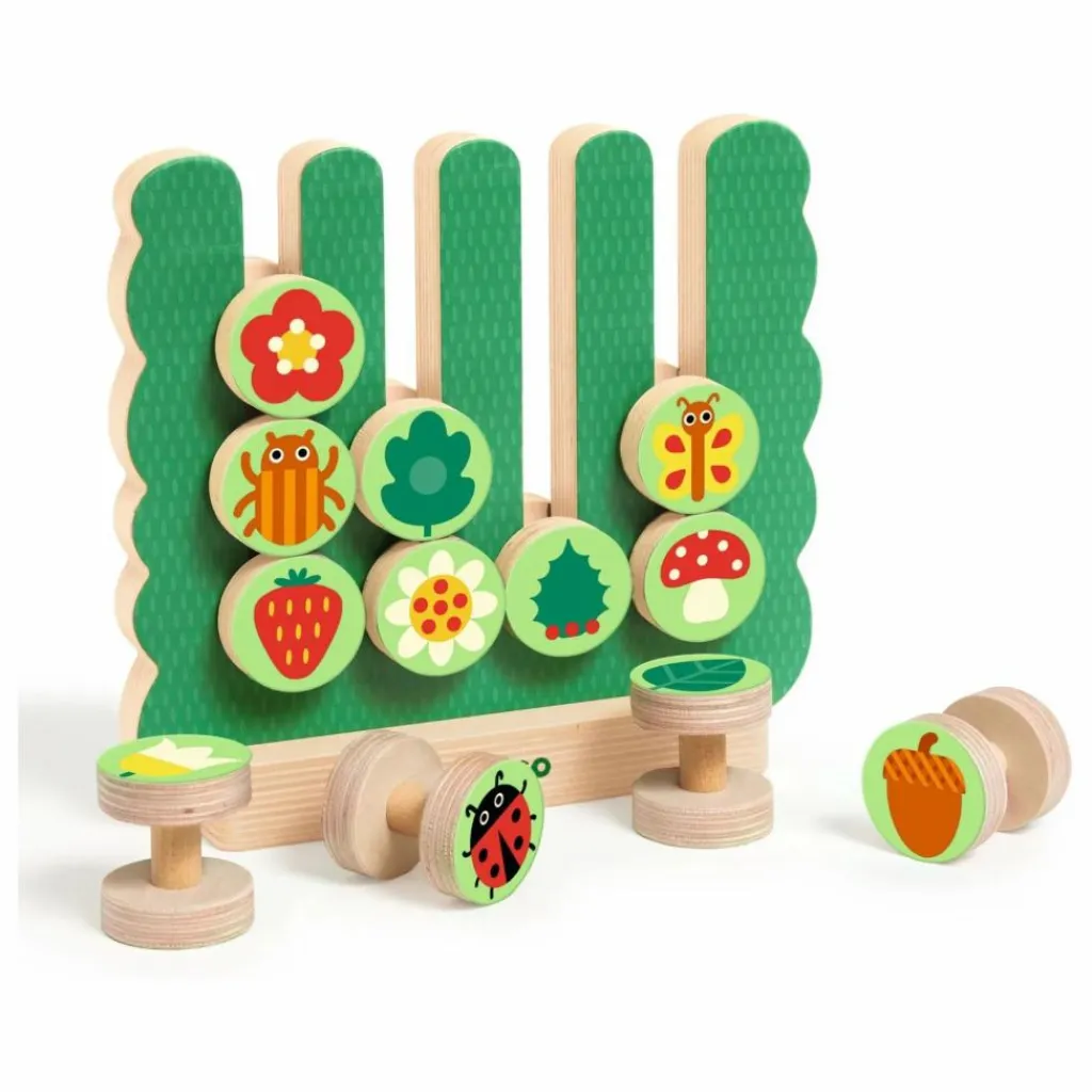 - Un jeu de reproduction de combinaisons colorées et illustrées. L’enfant choisit une carte modèle, sélectionne les bonnes pièces en bois et les glisse dans le support pour reproduire parfaitement la séquence de la carte. Mais attention, ce n’est pas si facile, car les pièces ont des images légèrement différentes au recto et au verso.