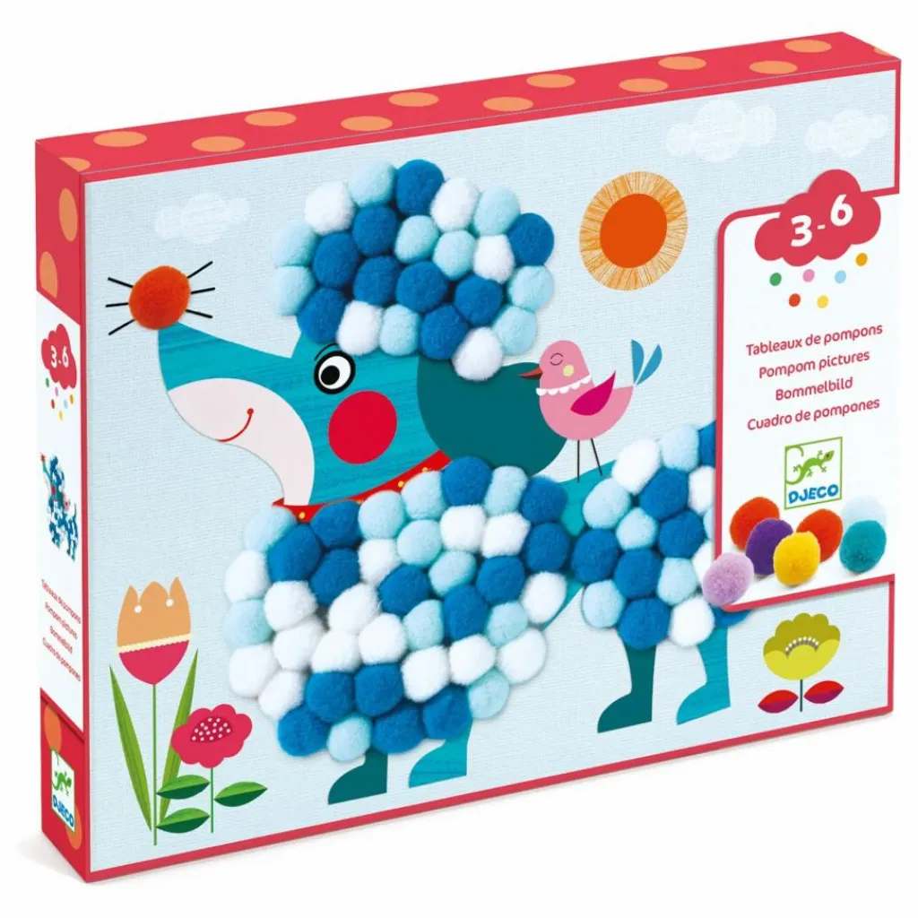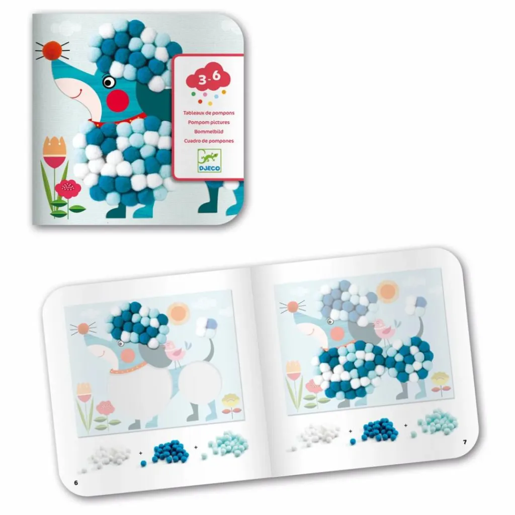 - 3 tableaux illustrés en carton épais, 345 pompons colorés et 1 livret explicatif pas à pas.