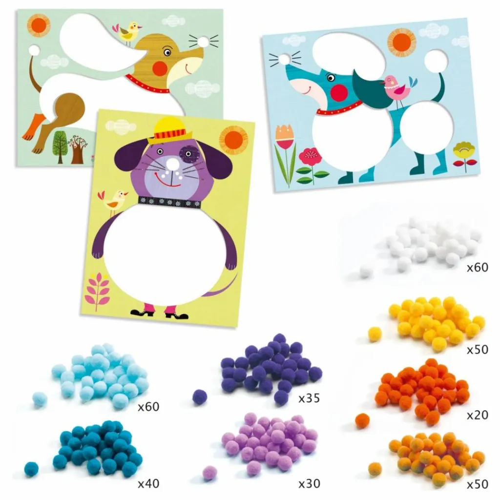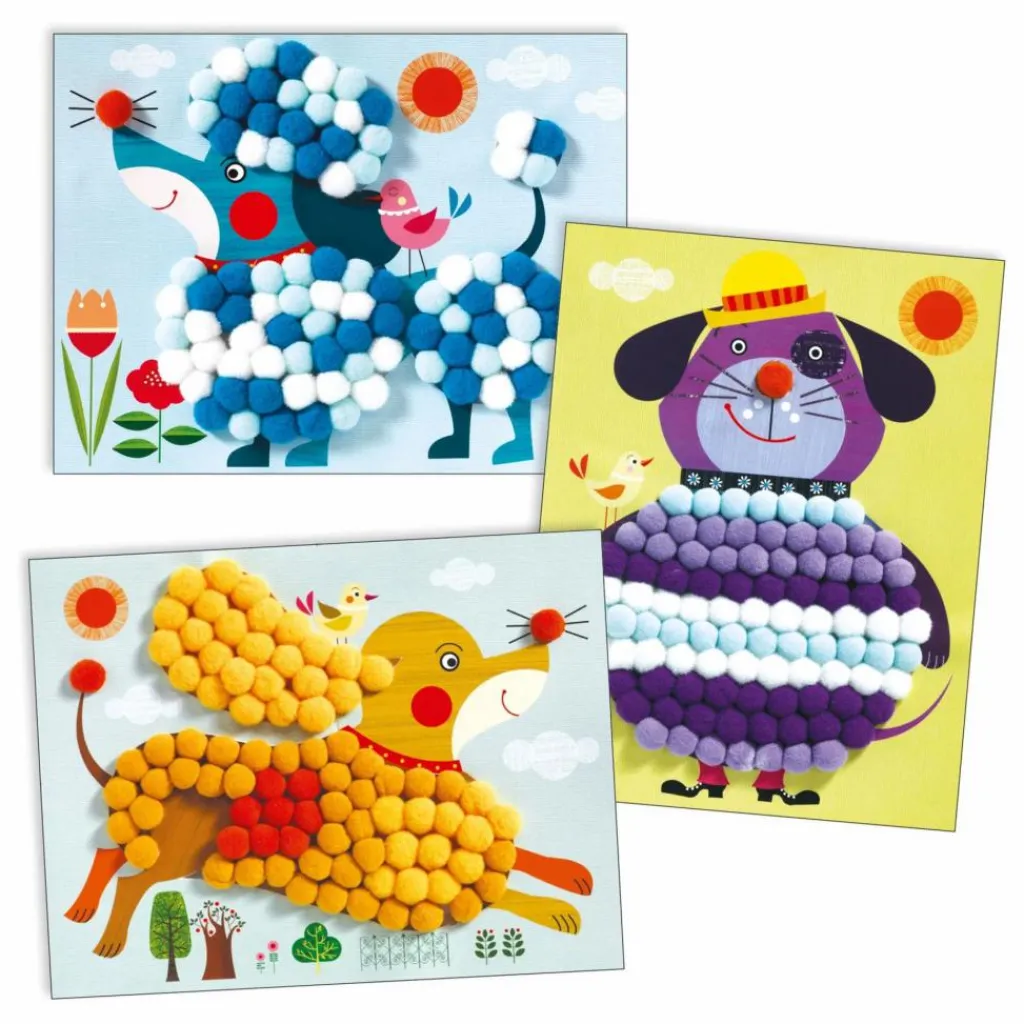 - Une activité de collage pour compléter les 3 chiens avec des pompons. En suivant les modèles du livret explicatif, l’enfant colle les pompons colorés sur les parties autocollantes des 3 tableaux illustrés. Surprise, 3 chiens tous doux à caresser apparaissent !