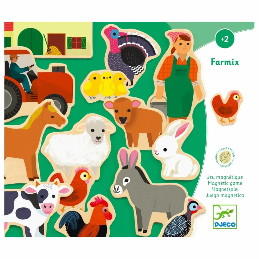 Ce coffret contient 24 pièces magnétiques en bois sur le thème de la ferme.
