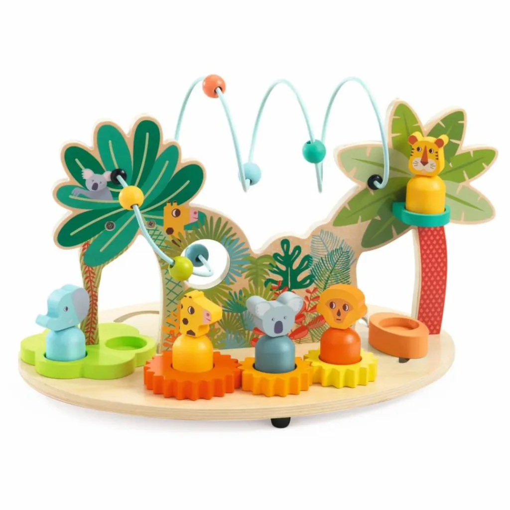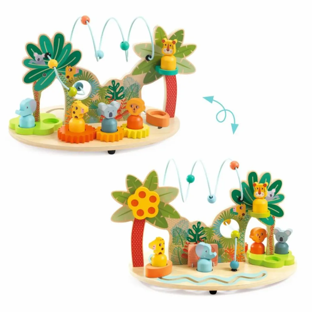 les animaux montent dans le petit bateau poussé par l’enfant sur le circuit qui traverse le mur de jungle. Ils tournent et dansent sur les 3 engrenages, ils font la ronde sur la roue autour des lianes, ils se passent les billes d’un côté à l’autre de la jungle, ils font disparaître les billes sur le deuxième circuit, ils se posent sur les 2 perchoirs, ils ouvrent la porte pour se poser en dessous, et ils font tourner les noix du palmier qui font du bruit.