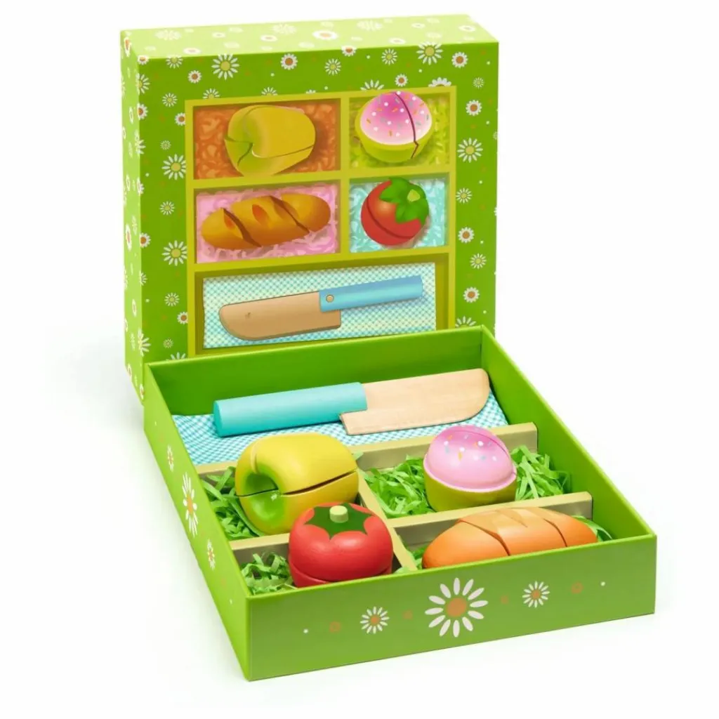- On pique-nique comme les grands ! Tout le nécessaire pour un pique-nique à la campagne dans une belle boîte joliment décorée. À l’aide de son couteau en bois, l’enfant partage son repas avec ses amis.