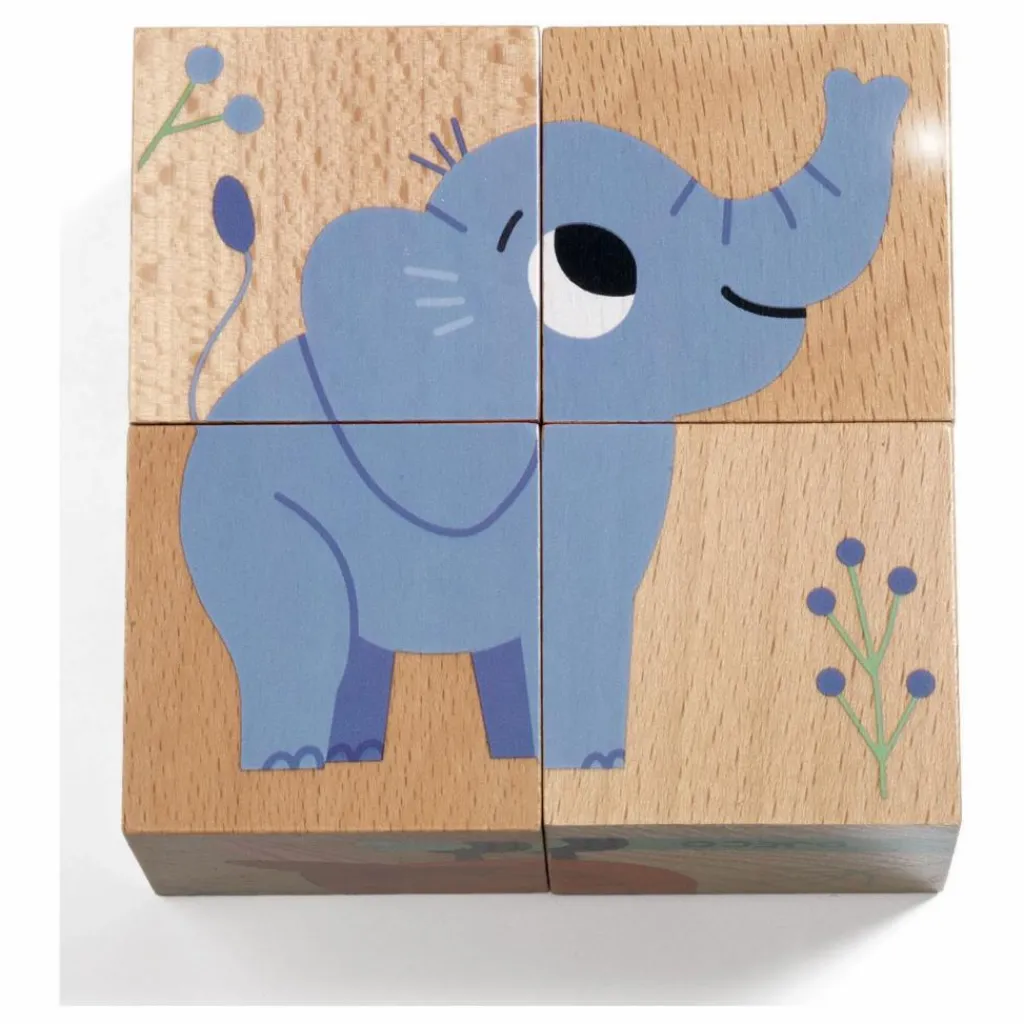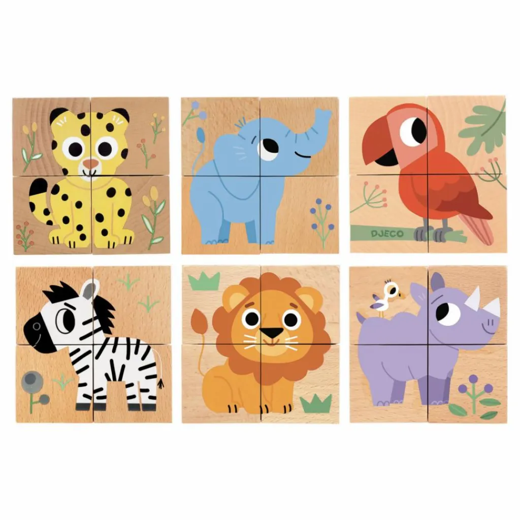 Wild & Co se compose de 4 cubes en bois qui permettent de reconstituer 6 puzzles sur le thème des animaux sauvages.