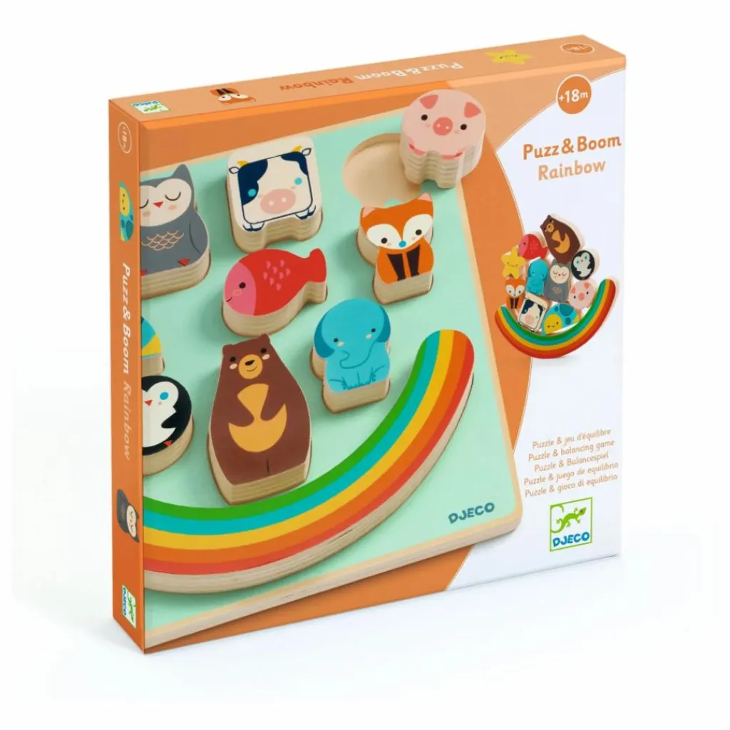 Puzz & Boom est un puzzle en bois facile à assembler et un jeu d’équilibre. Les animaux en relief tiennent debout et peuvent se poser en équilibre les uns sur les autres pour former une pyramide sur le socle « arc-en-ciel ».