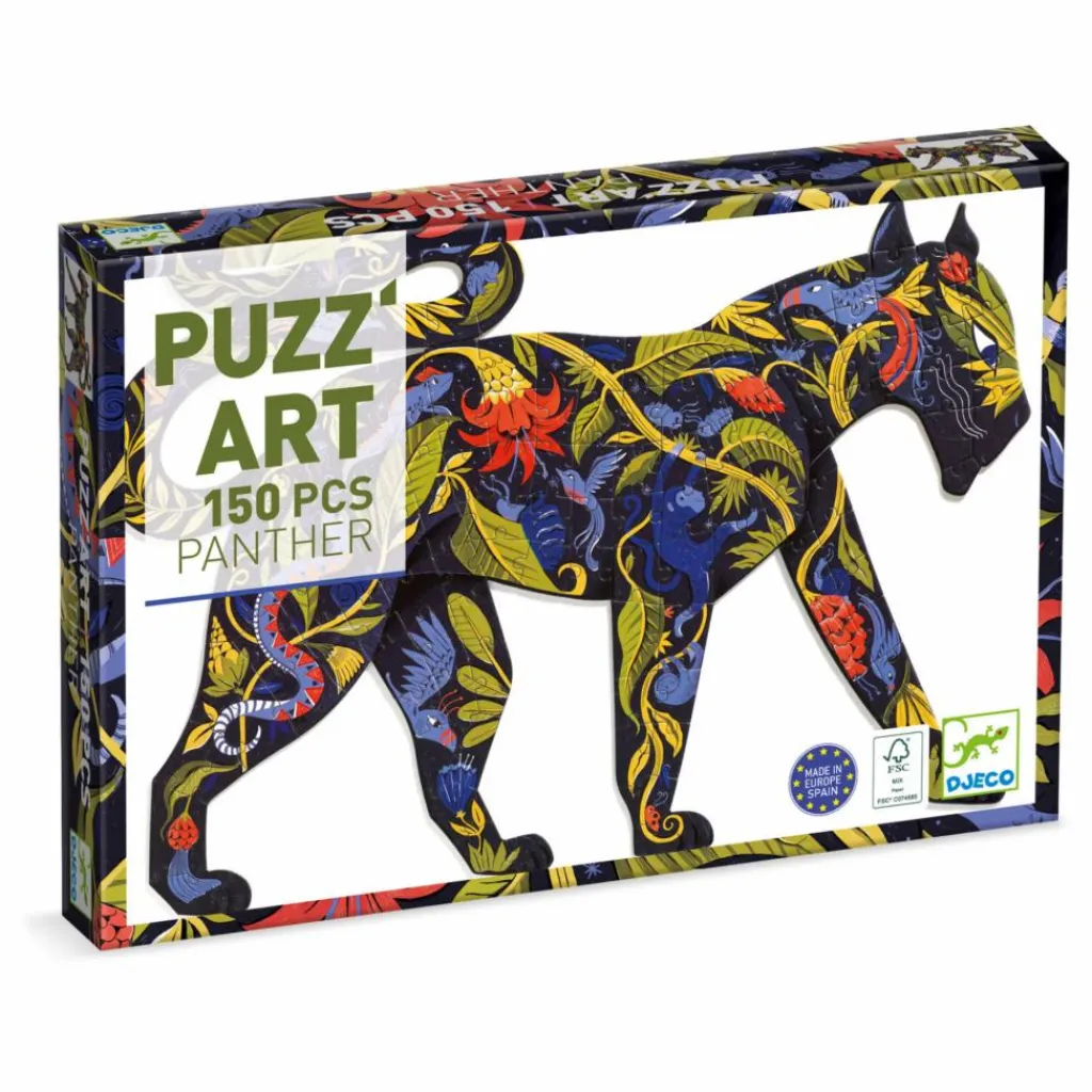 - Le Puzz’Art Black Panther est un puzzle de 150 pièces. Dans un format inédit, sans coins ni bordures, tout l’art du puzzle est bousculé. À travers cette grande silhouette ajourée, dans laquelle fourmille un monde imaginaire, votre enfant découvre une majestueuse panthère noire.