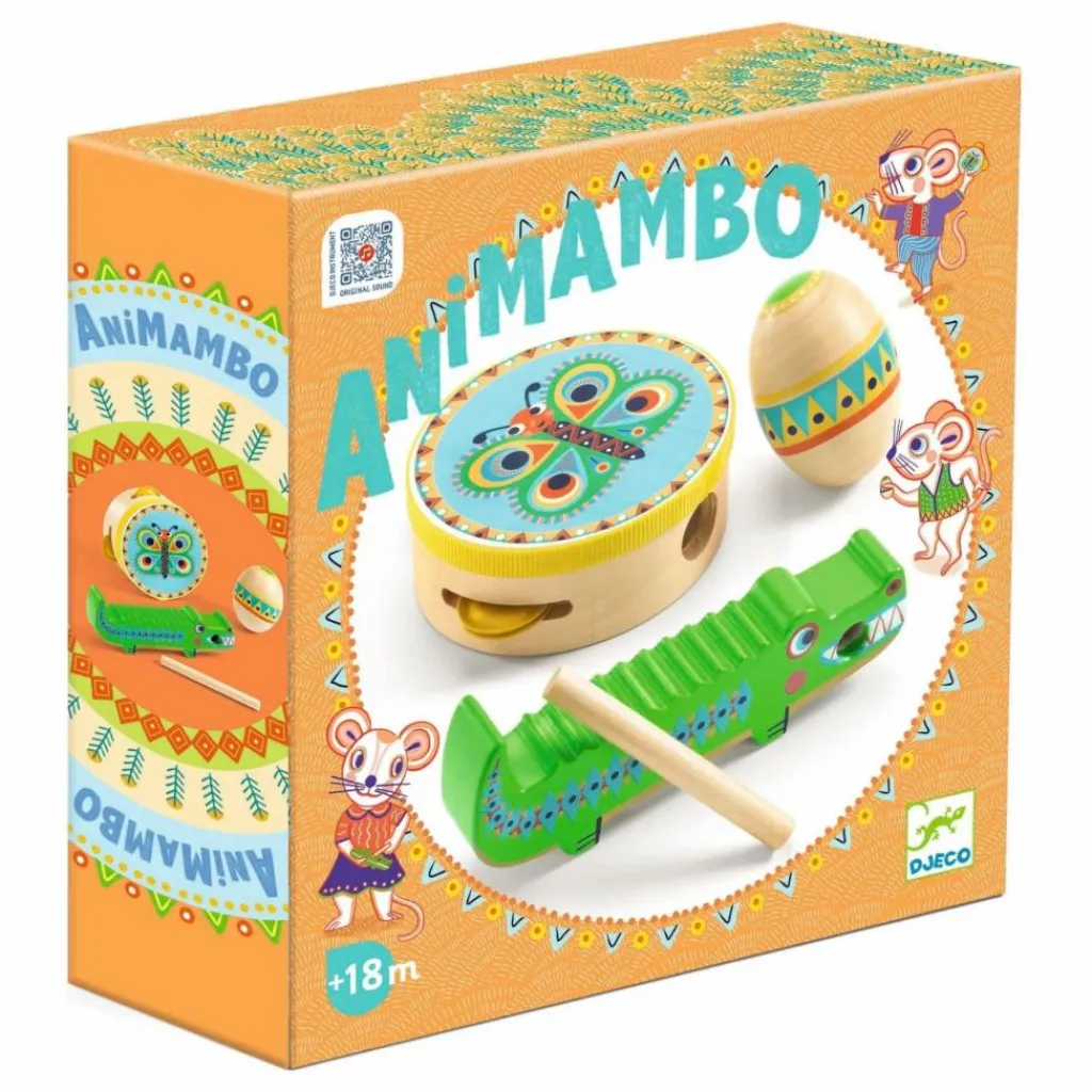 - Un magnifique set de trois instruments adaptés aux tous petits, joliment illustré : un tambourin papillon, une maracas œuf et un guiro crocodile. Le cadeau idéal pour s’éveiller à la musique avec des percussions !