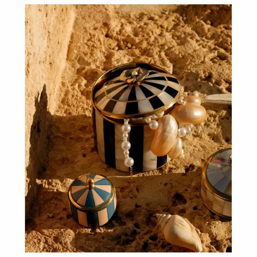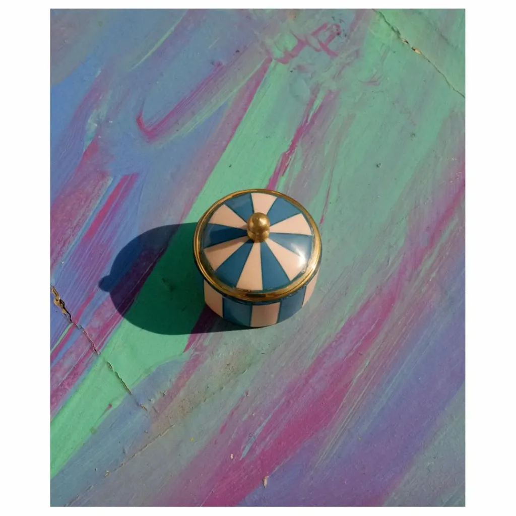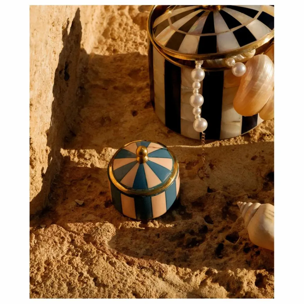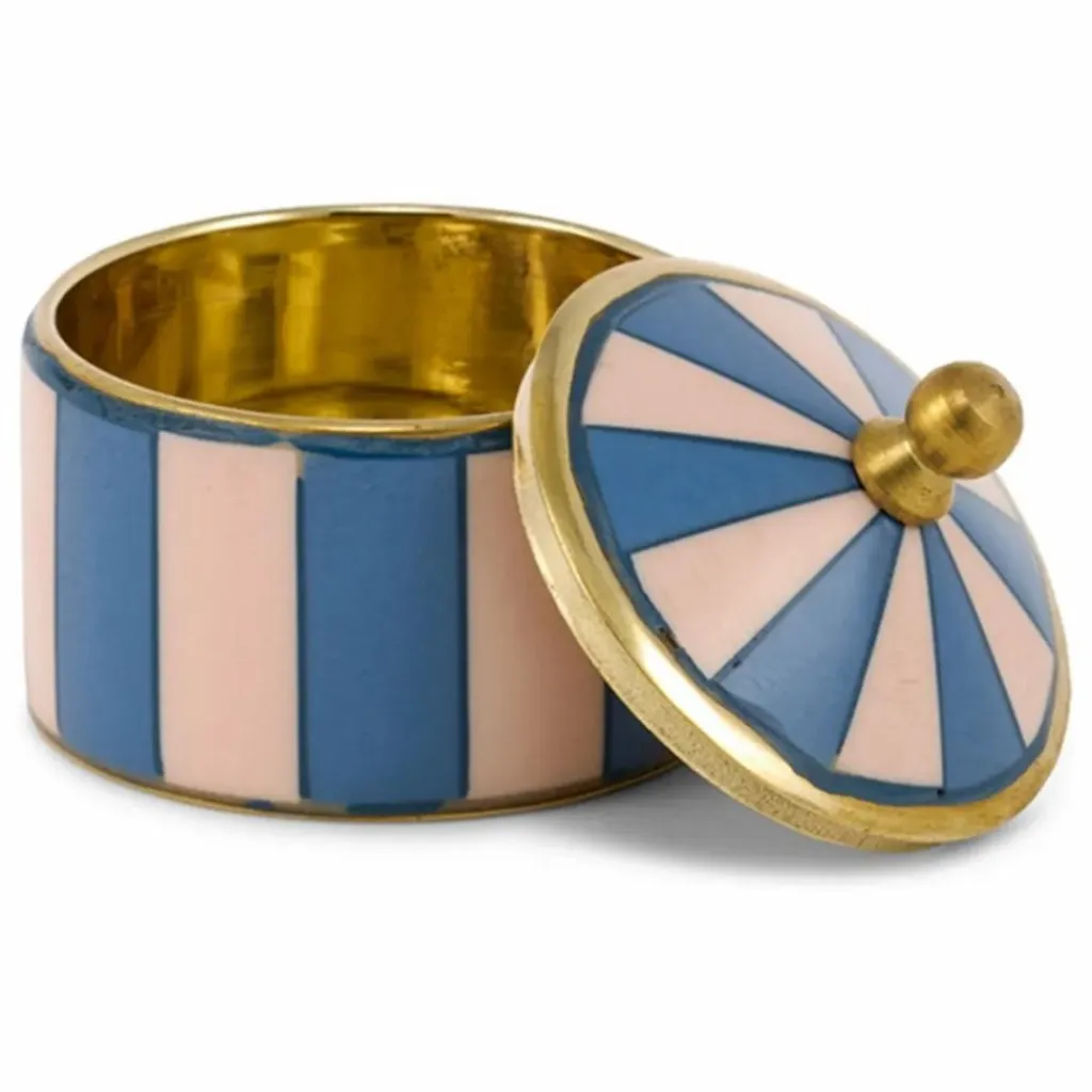 - Améliorez votre espace avec la Bailey Circus Box Blue, une boîte magnifiquement fabriquée à la main qui allie le charme ludique à la sophistication. Dotée d’un ravissant motif rayé bleu et rose rehaussé de détails en laiton doré, cette pièce est à la fois décorative et pratique. De taille compacte (5 x 5 x 5 cm), elle est parfaite pour ranger bijoux, bibelots et autres petits trésors.