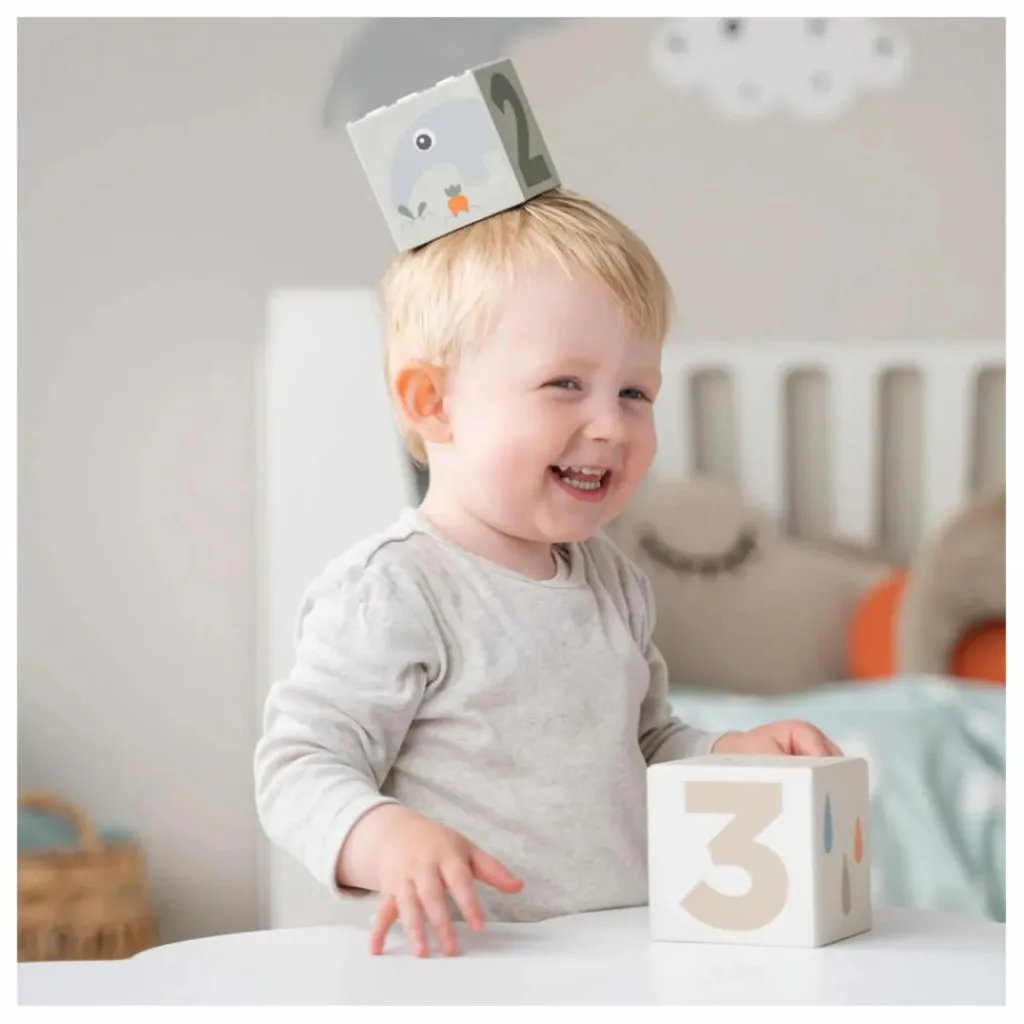 • Votre enfant pourra empiler les cubes pour ensuite les faire dégringoler et cacher des petits trucs dedans