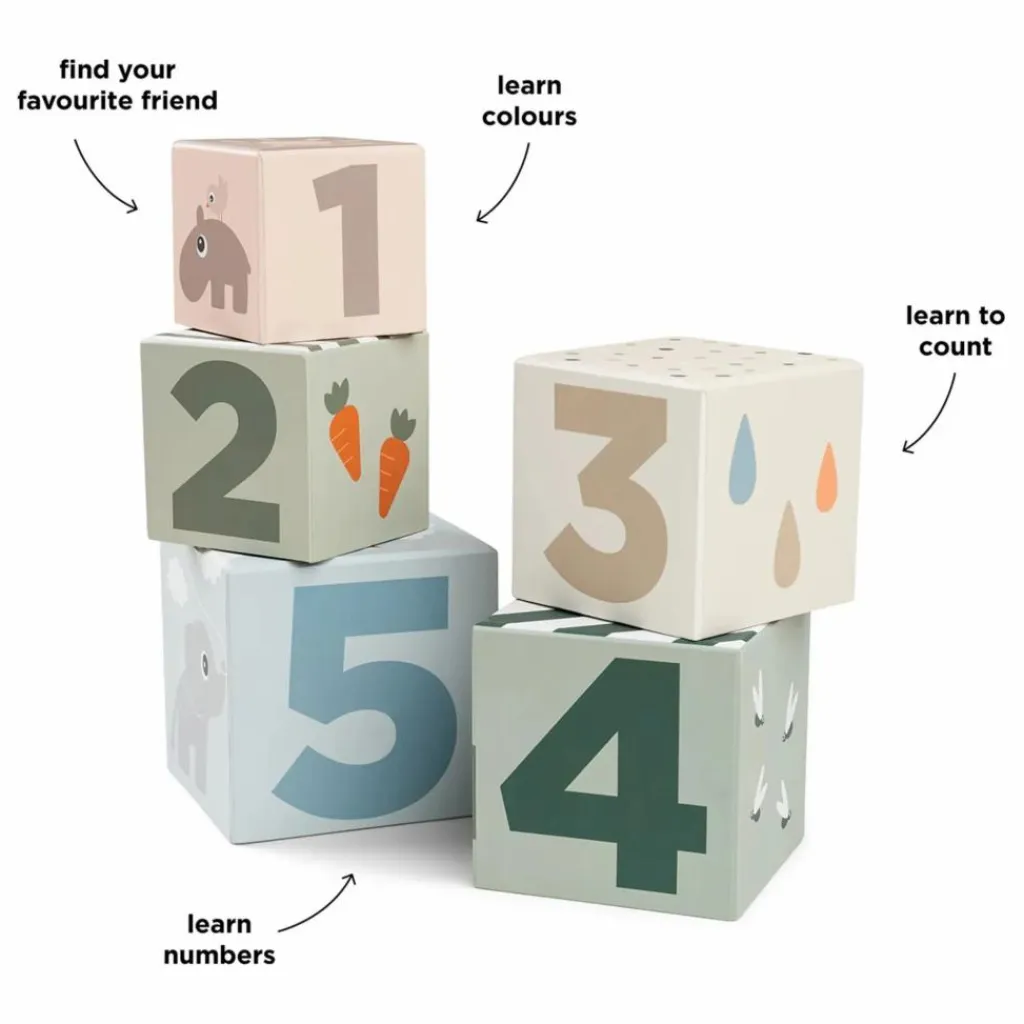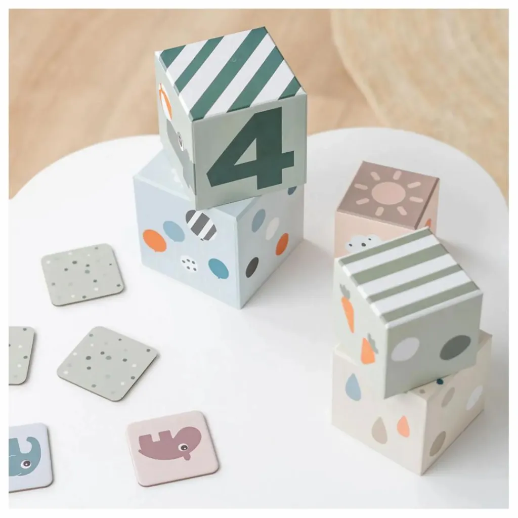 - • 5 cubes à empiler de 7×7 cm à 13×13 cm dans un mélange de couleurs douces