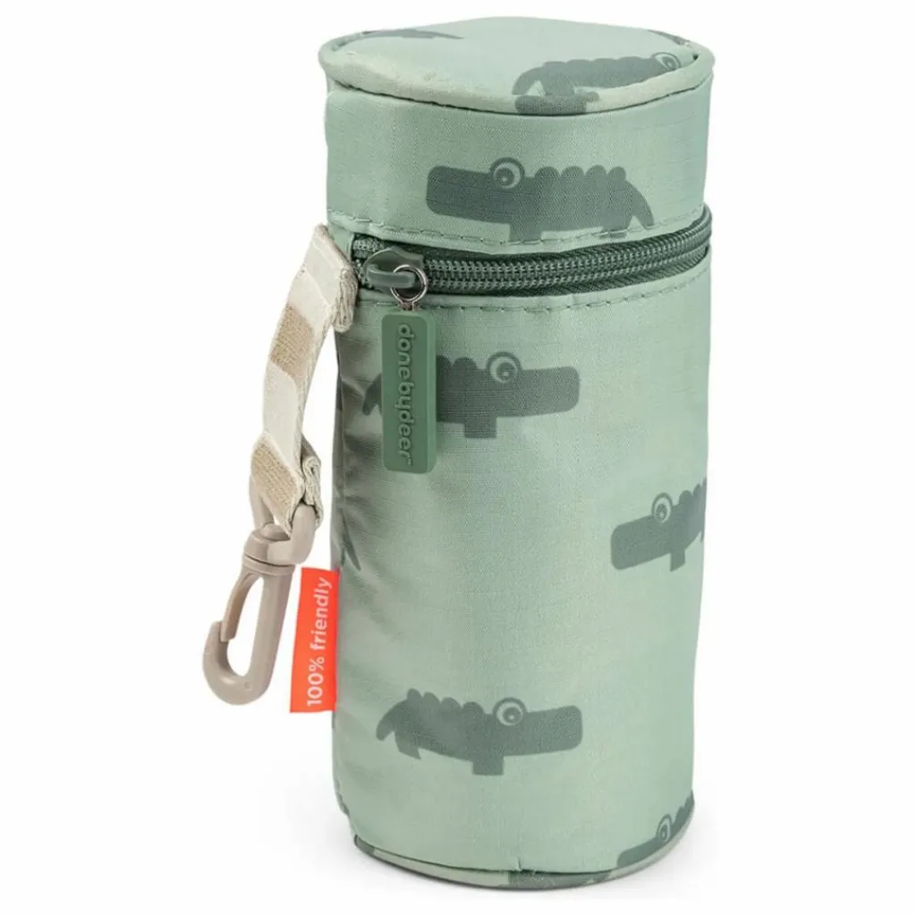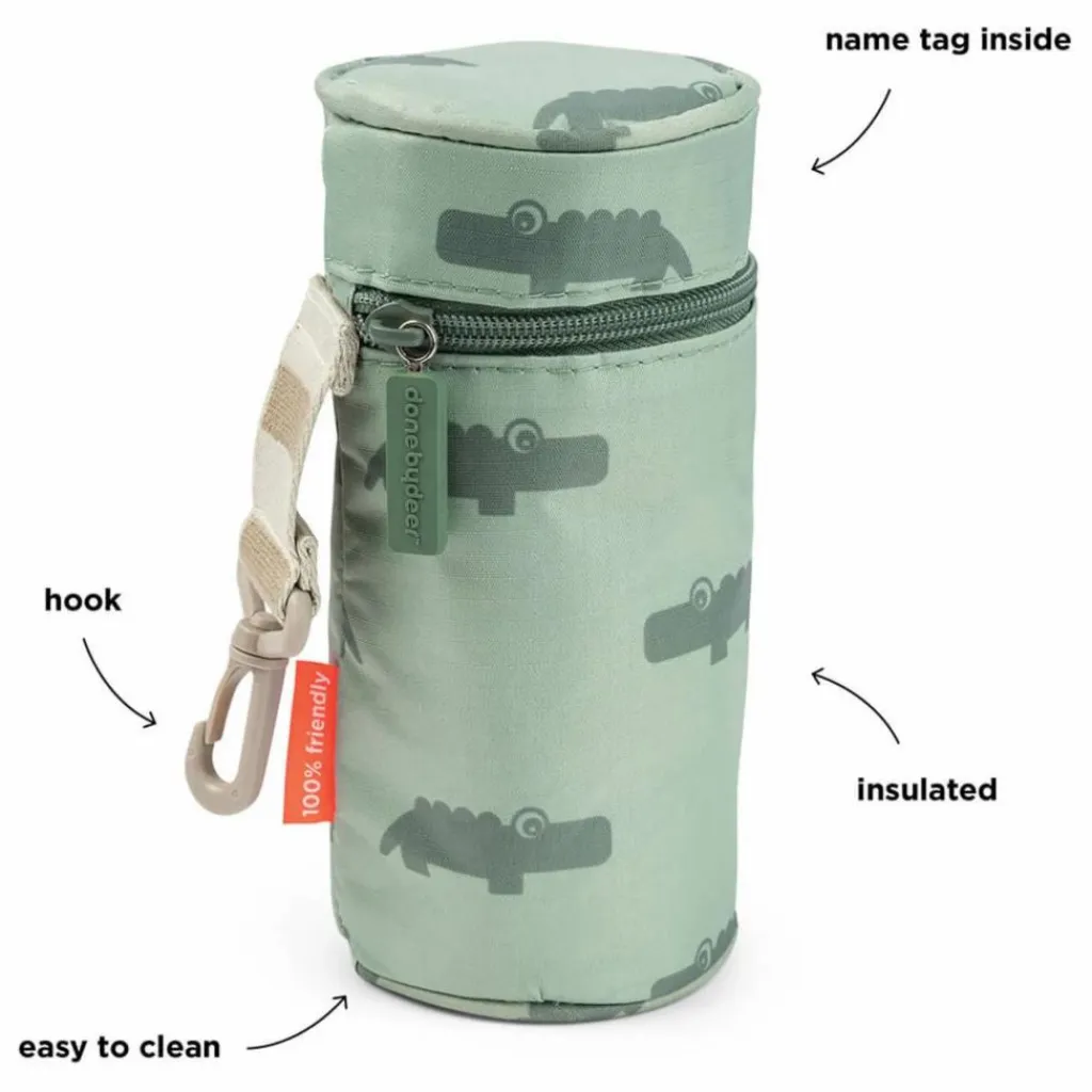 - La housse isotherme Croco garde les boissons bien au frais – ou au chaud ! Le tissu isolant à l’intérieur assure que les boissons gardent la température désirée pendant des heures. Les bouteilles Done by Deer ont la taille idéale pour la housse. Grâce à sa sangle, la housse isotherme est facile à porter. Elle s’attache aussi sur le sac à dos isotherme de Done by Deer. Le haut s’ouvre facilement avec un zip. En ouvrant le haut, vous découvrirez l’étiquette avec Croco. La housse verte est décorée du chaleureux crocodile Croco. Elle est en polyester, une matière durable et résistante à l’eau, ce qui la rend facile à nettoyer avec un chiffon humide. Sur la sangle on retrouve les rayures signature de Done by Deer.