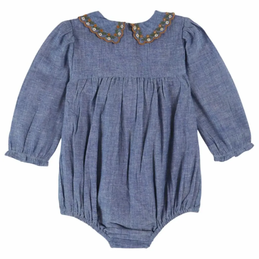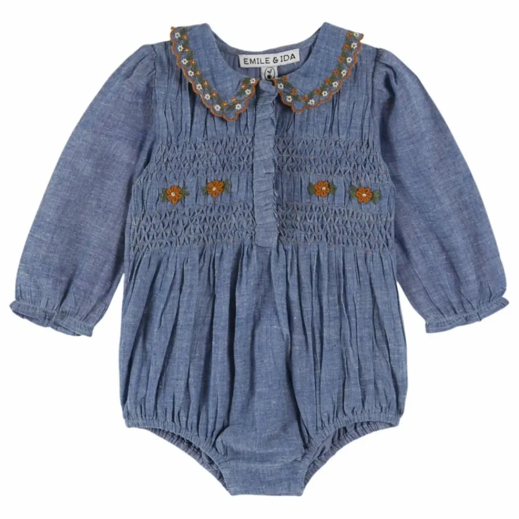 - Combibloomer à smocks en coton chambray bleu. Il est confectionné dans un tissu doux et fluide.