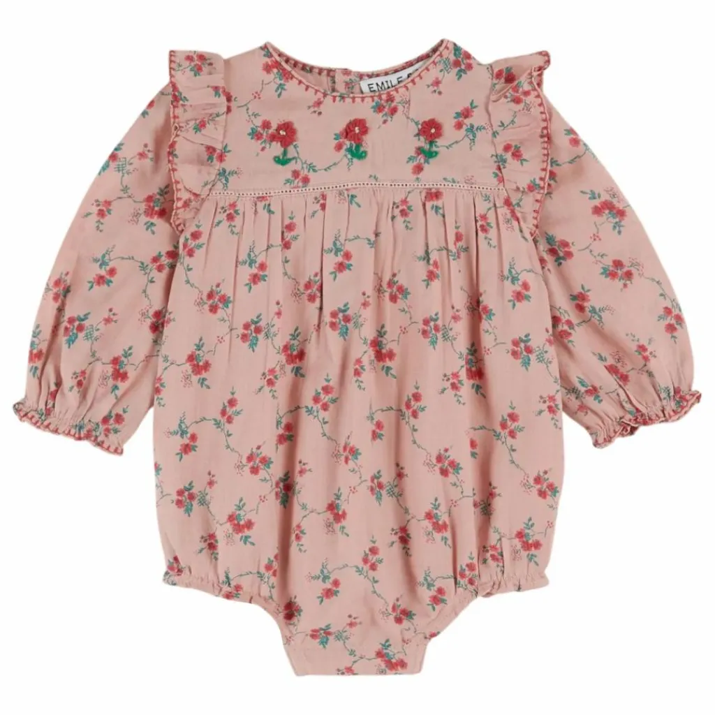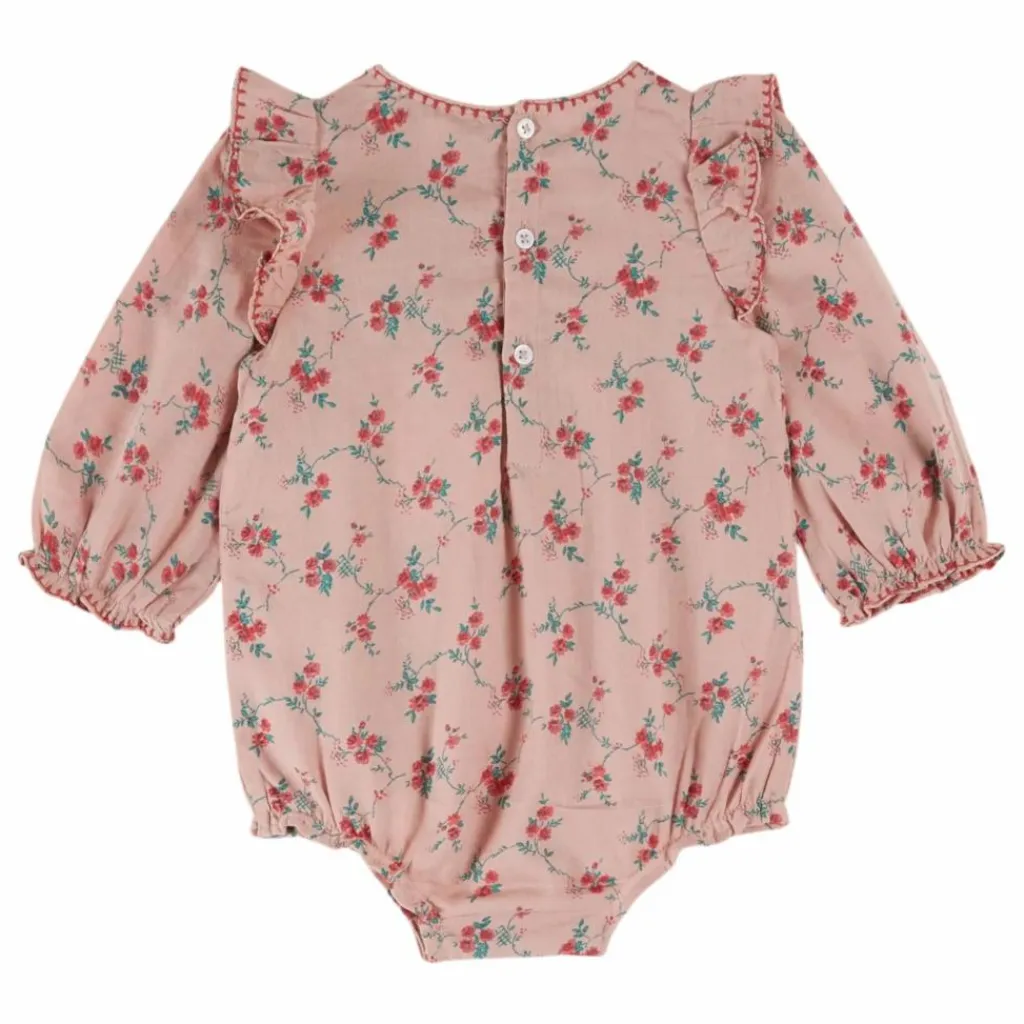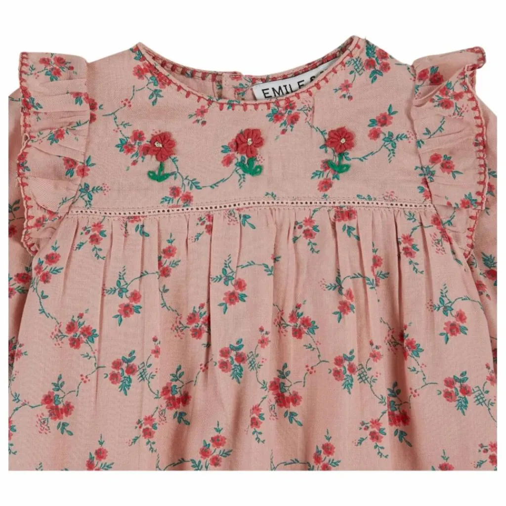 - Combibloomer en coton orné de bouquets fleuris sur fond rose. L’empiècement est agrémenté par des fleurs rose tyrien brodées au point de croix par des artisans indiens.