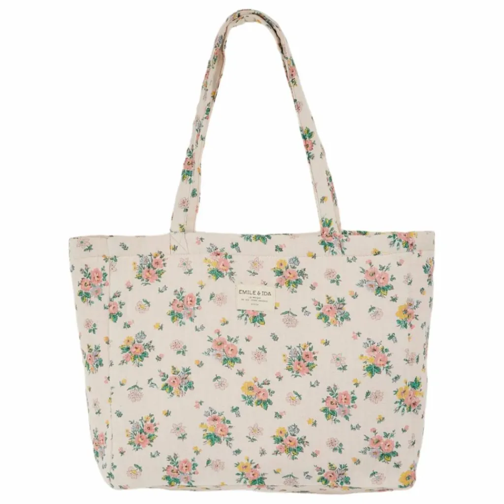- Ce cabas à soufflets en coton beige poudré, parsemé de fleurs rose pastel relevées de touches de jaune, pourrait bien rivaliser avec le célèbre sac de Mary Poppins. D’une grande contenance, il semble capable de tout transporter avec élégance et magie. Sa doublure en coton rose à fines rayures blanches et vertes ajoute une touche raffinée, tandis qu’une petite poche intérieure pratique garde votre téléphone à portée de main. Un compagnon poétique et pratique, prêt à vous suivre dans toutes vos aventures du quotidien.