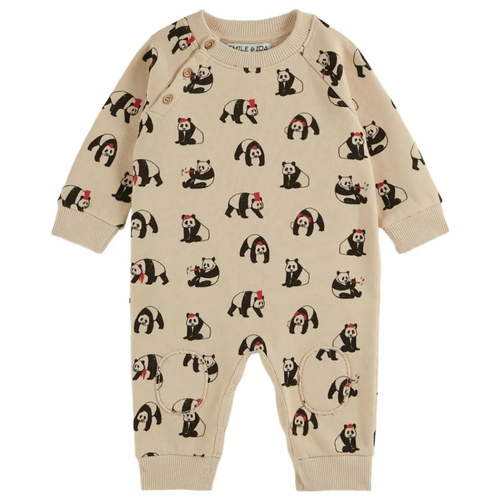 - Combinaison en coton biologique molletonné et gratté écru sur lequel des pandas facétieux font les polissons. L’un joue de la flûte, un autre écoute de la musique quand un troisième se balade.