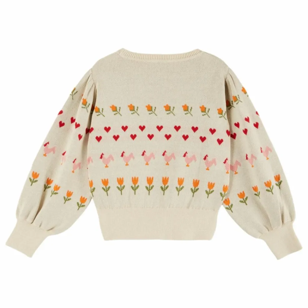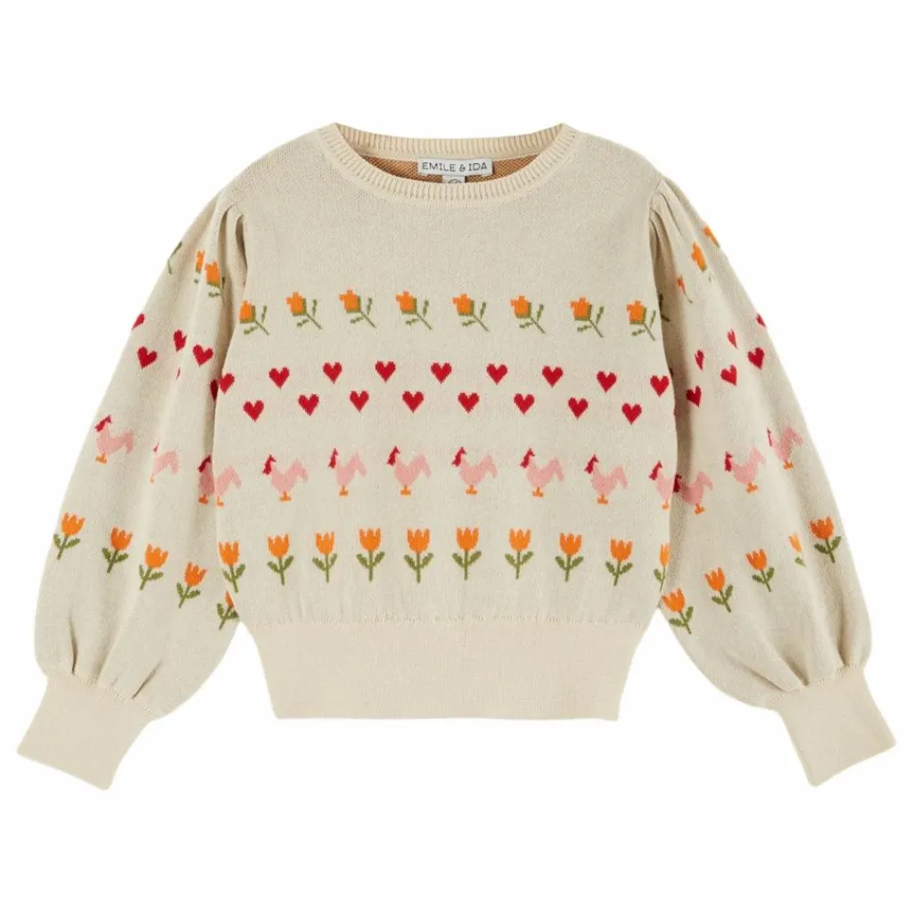 - Pull jacquard intarsia en coton biologique rose, orné d’une ligne de poules écrues encadrée de fleurs et de cœurs rouges. Le point fantaisie dans lequel le pull est tricoté apporte une texture différente du graphisme du point de jersey, tandis que la technique du jacquard intarsia ajoute de l’épaisseur à la pièce.