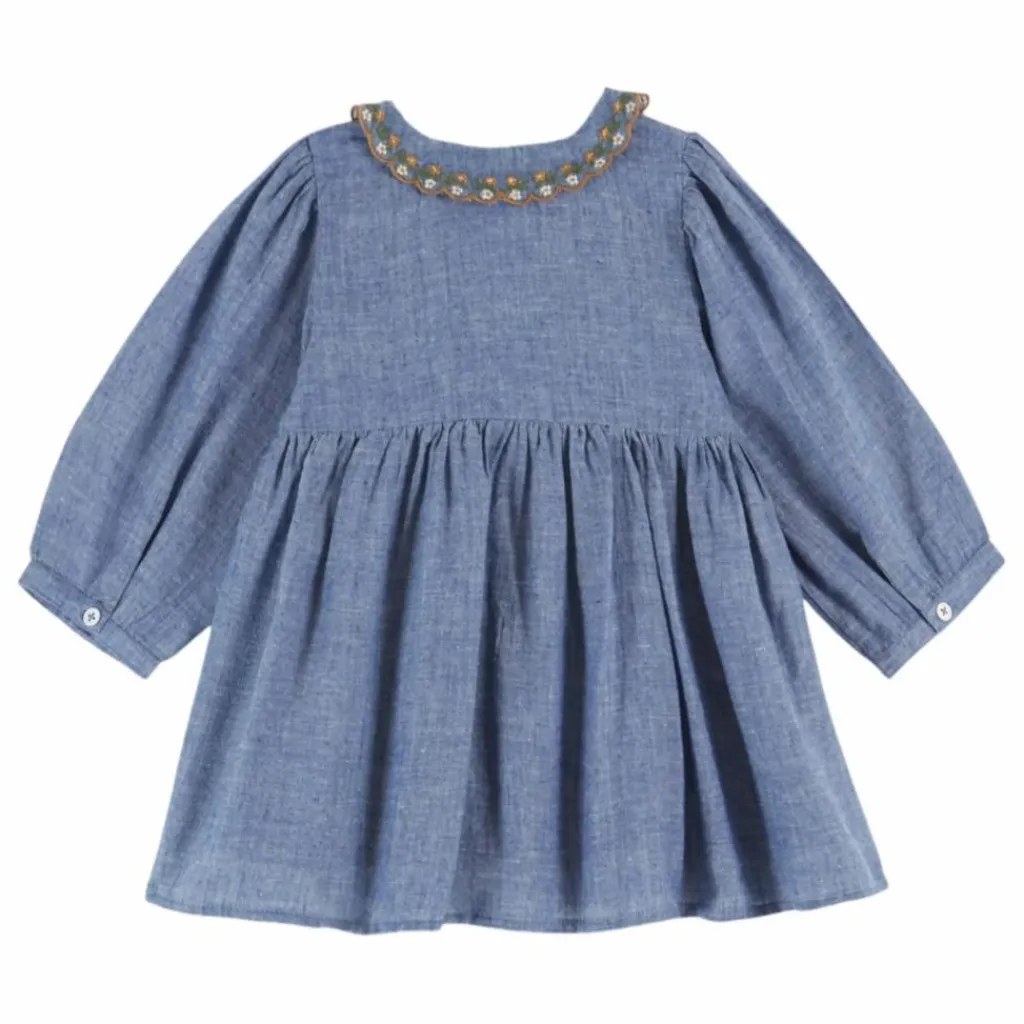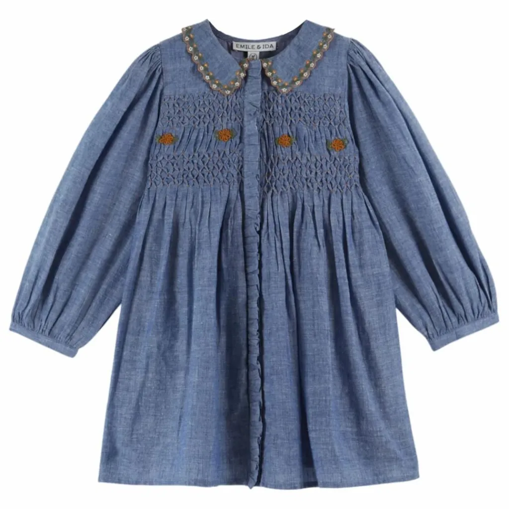 - Robe smockée en coton chambray bleu. Les fronces, générées par les smocks, s’évasent librement jusqu’en bas de la robe.