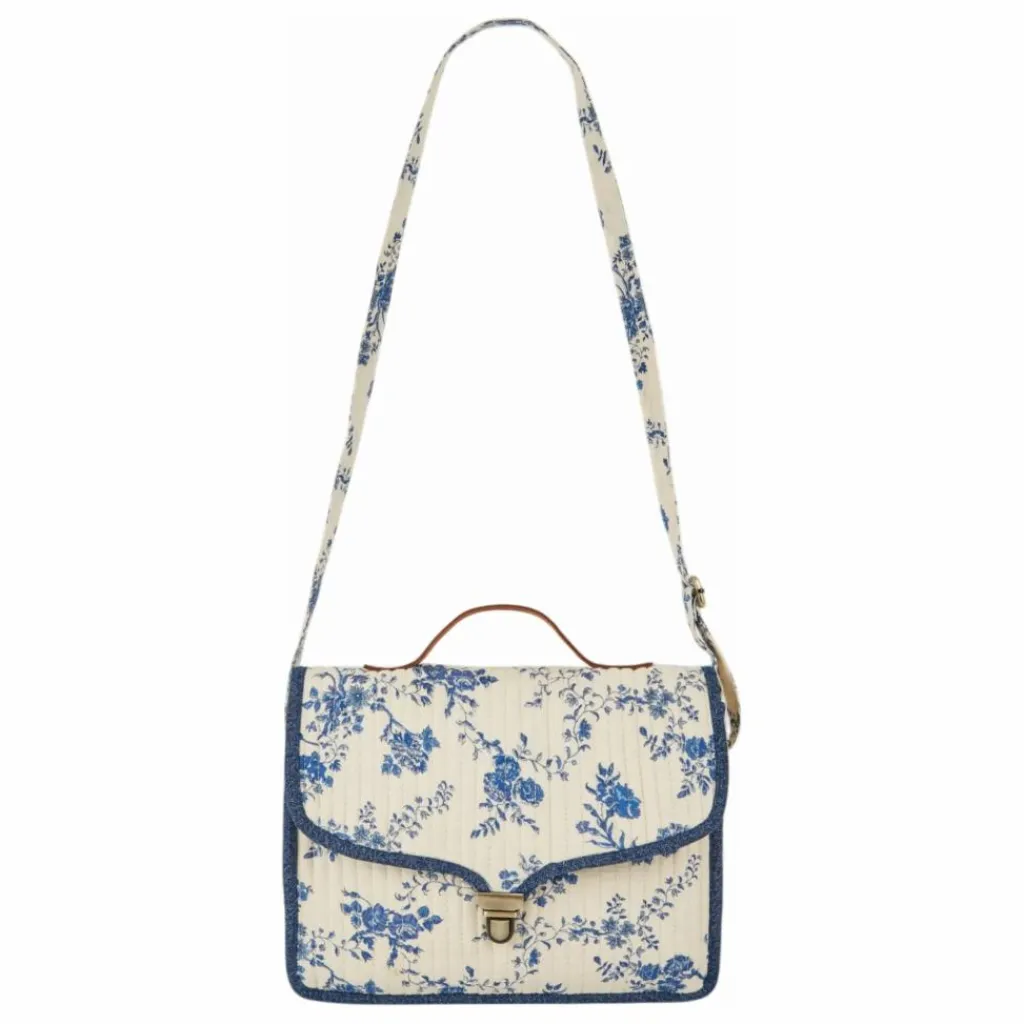 - Sacoche à bandoulière écrue en coton molletonné et surpiqué, parsemé de fleurs bleues.