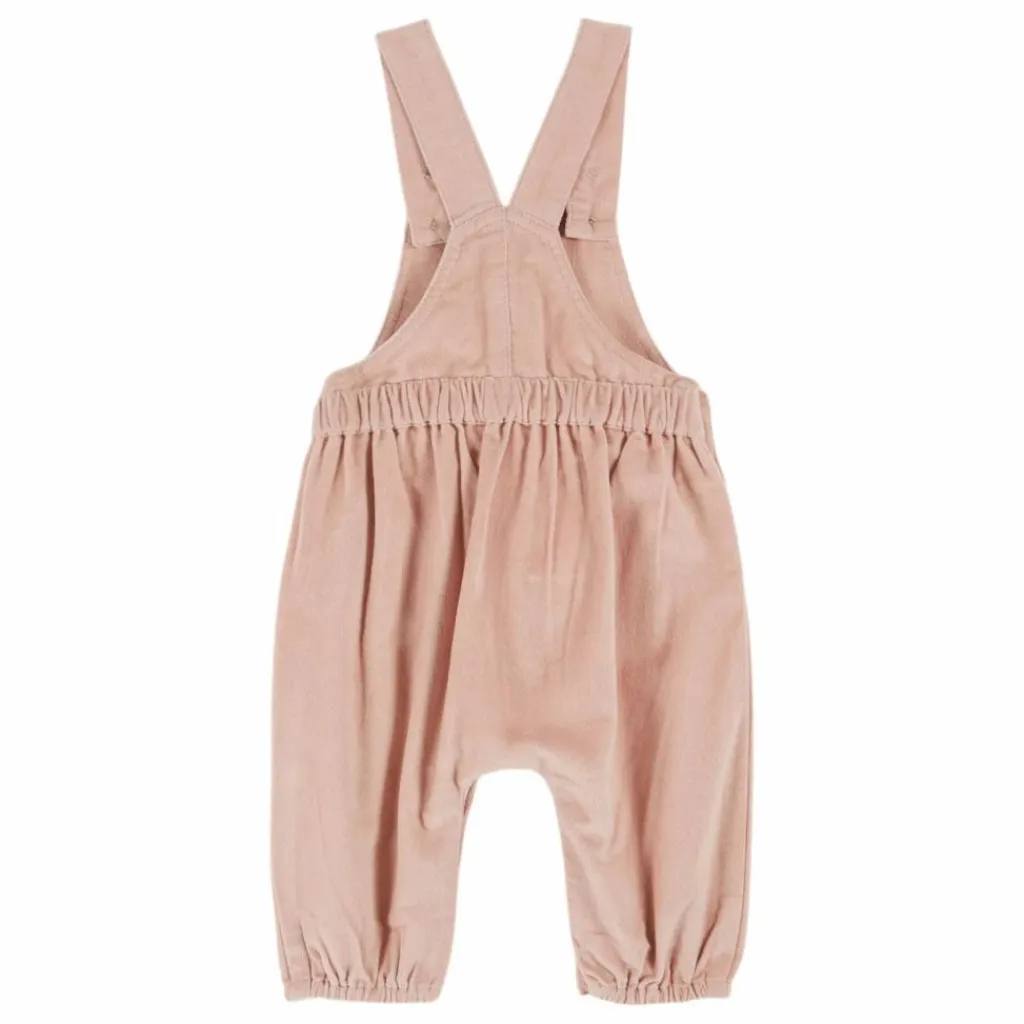 - Salopette en velours de coton ras rose poudré animée par deux poches fleurs plaquées.
