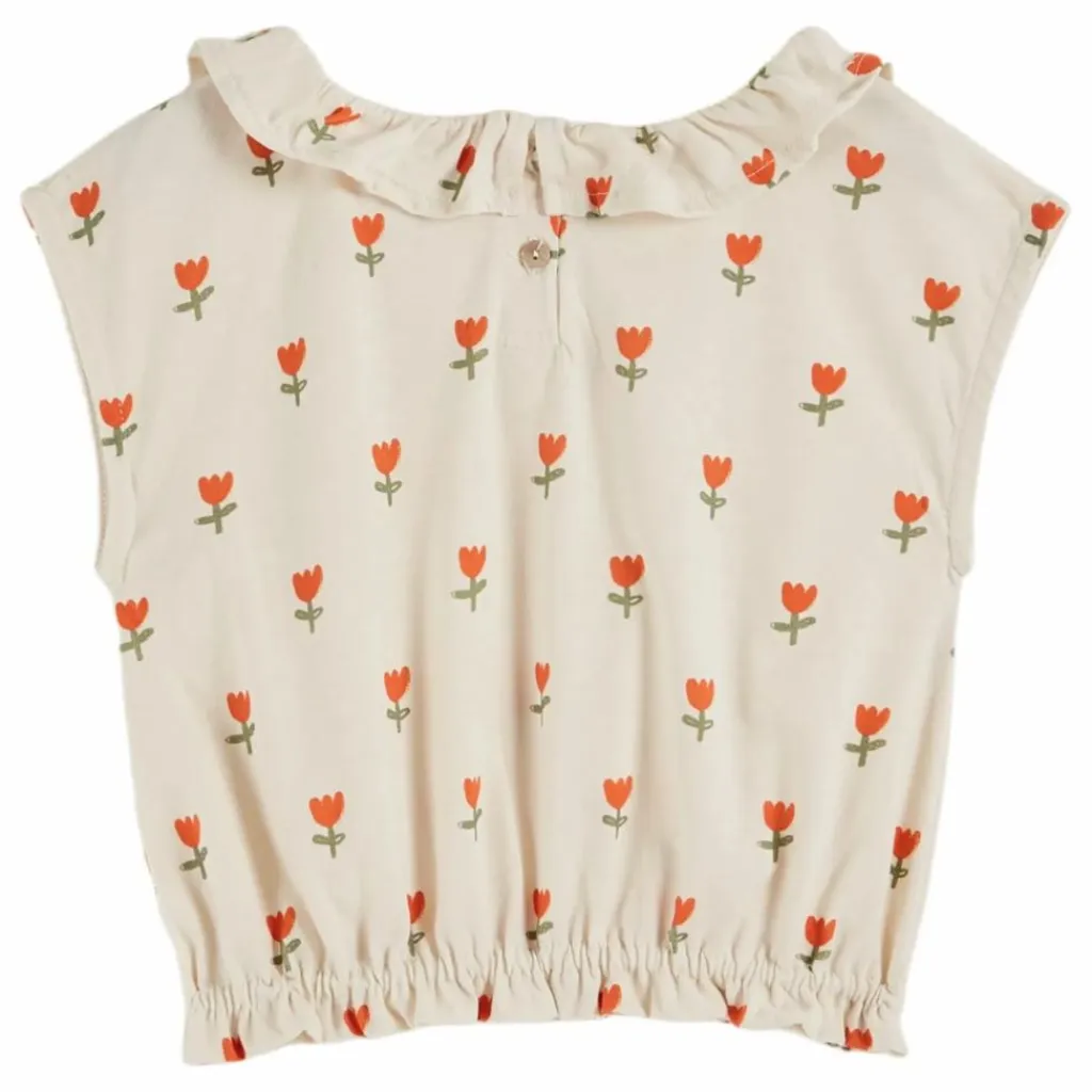 - Tee-shirt en jersey de coton biologique écru sur lequel s’épanouissent de belles tulipes rouge vermillon. Elles sont disposées avec une telle harmonie que l’on pourrait les croire issues d’un jardin à la française, tant leur alignement est parfait. Ce tee-shirt sans manches pourrait-il être l’œuvre de stylistes inspirés par André Le Nôtre ? Une collerette autour de l’encolure ajoute une touche de charme, et la base élastiquée crée un effet blousant. Une petite fente dans le dos, fermée par des boutons en nacre naturelle, permet de l’enfiler facilement sans difficulté. Voilà un tee-shirt conçu pour vivre les beaux jours dans une pièce agréable et confortable.