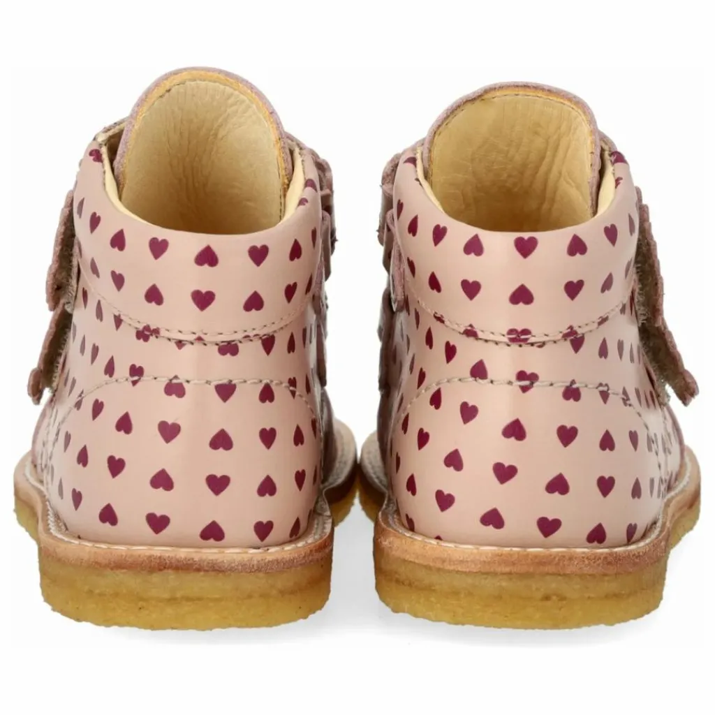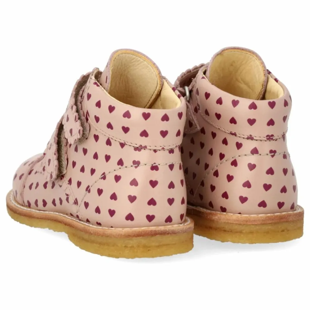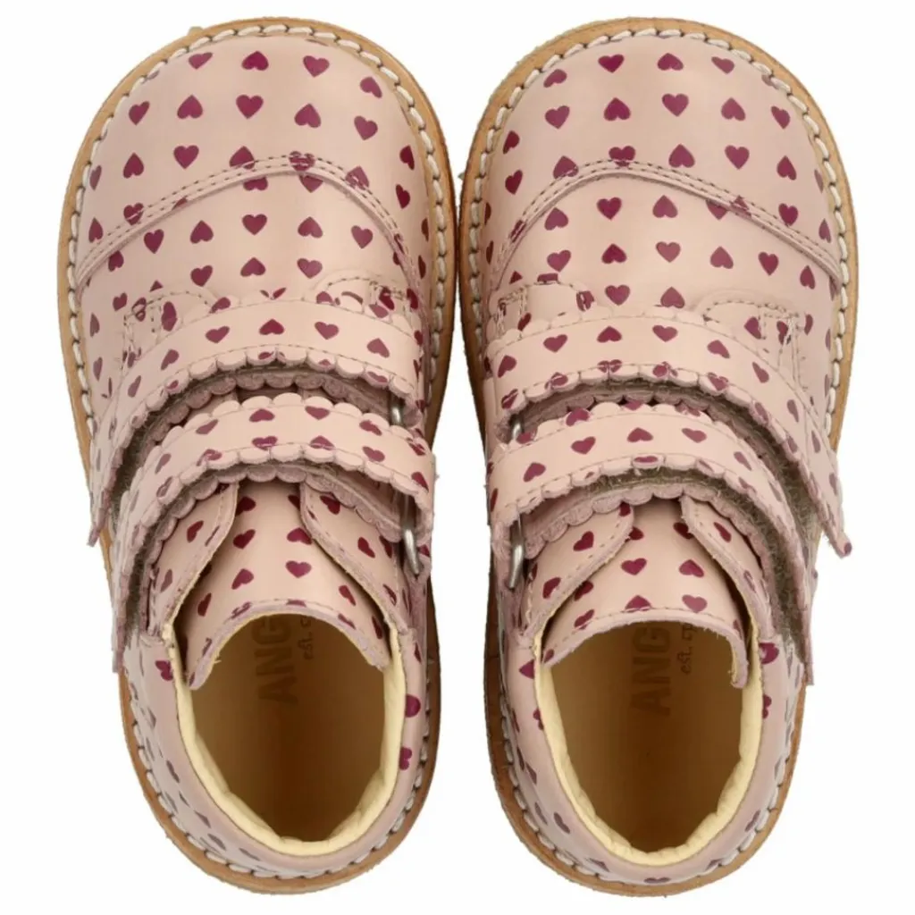 - Chaussure à velcro en cuir avec un imprimé cœur et une bordure décorative ondulée.