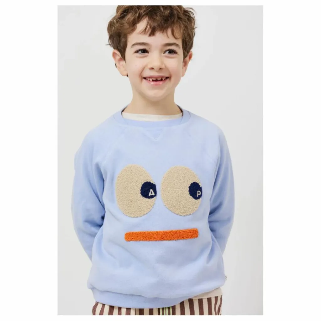 - Sweat relax . – Molleton en coton bio et emerise. – Col rond. – Manches raglans. – Finition bord cote au col, bas du corps et manches. – Detail « V » en bord cote au col. – Broderie « Smile » bouclette au millieu devant. – etiquette petit drapeau cousue a la couture cote. – H25GS06