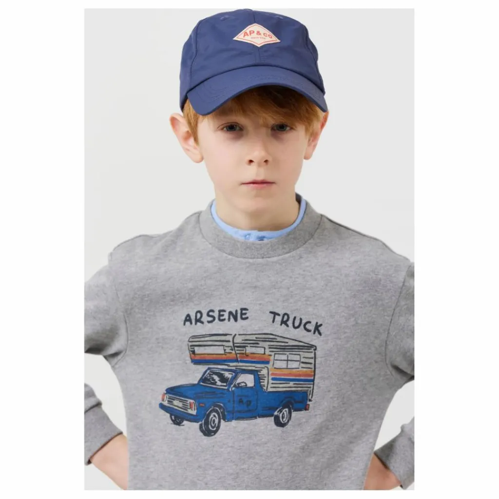 - Sweat loose . – Molleton en coton bio et emerise. – Col rond. – Manches montees. – Finition bord cote au col, bas du corps et manches. – Print « Truck » au millieu devant. – etiquette petit drapeau cousue a la couture cote. – H25GS07