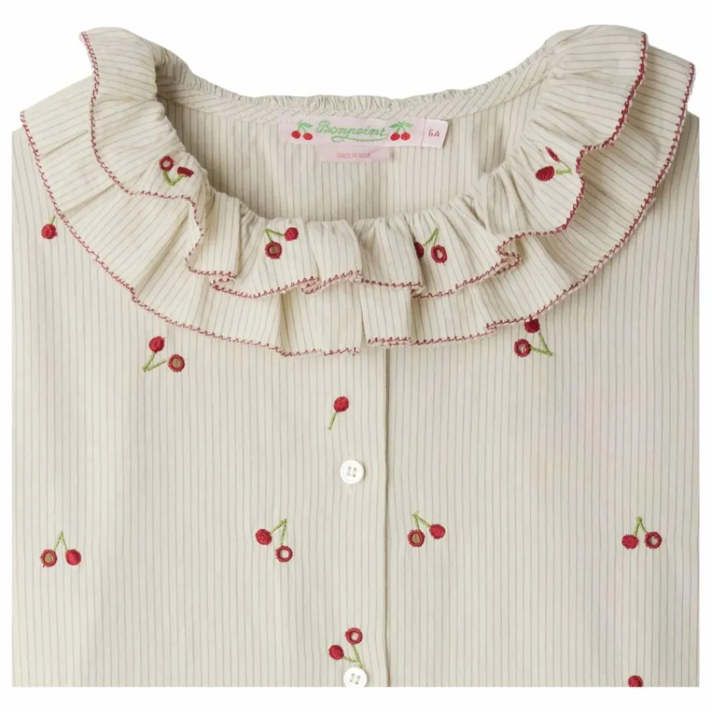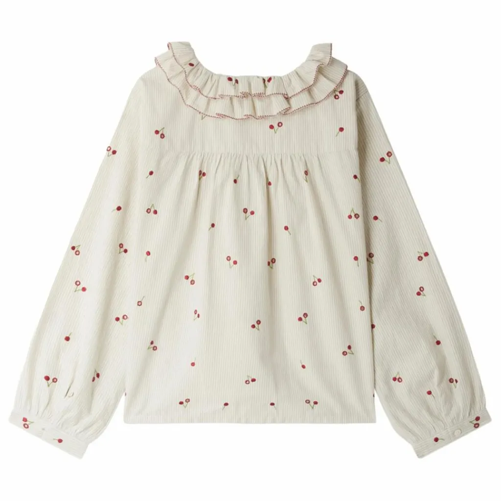 - La blouse Jaffa pour fille est confectionnée en coton issu de l’agriculture biologique. Son imprimé discret à rayures verticales se rehausse des emblématiques cerises de la Maison brodées sur l’ensemble. Au niveau de l’encolure ronde, un double volant aux bords brodés donne du volume à ce modèle droit. Un petit bouton discret ferme chaque poignet pour plus de praticité.En coton biologiqueCoupe droiteBrodée cerisesDouble colleretteManches longues à poignets boutonnésOuverture à boutons nacrés devant