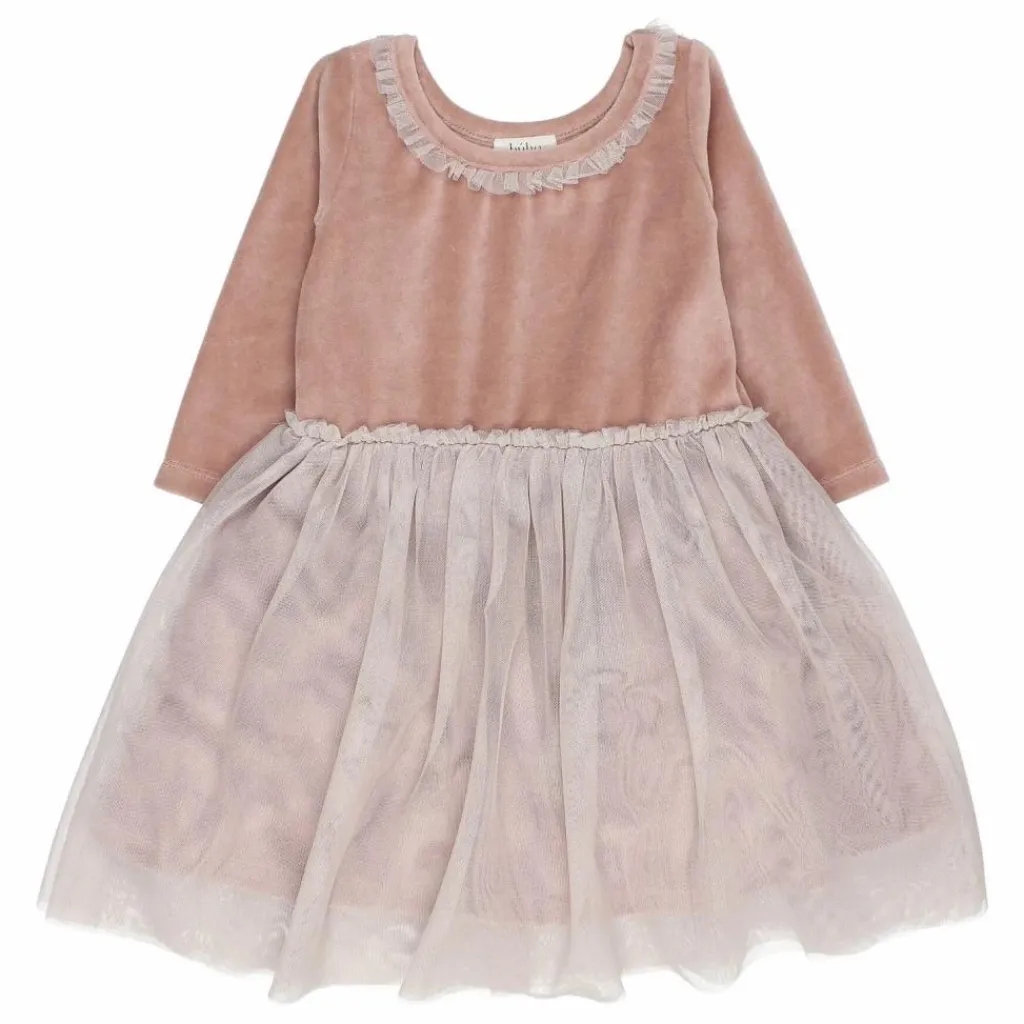- Robe combinée de style ballet. Corps en velours élastique avec manches longues et jupe en tulle froncé superposé. Encolure ronde avec volant de tulle.