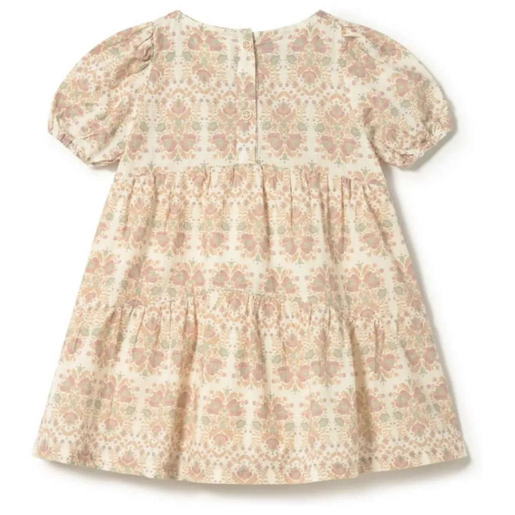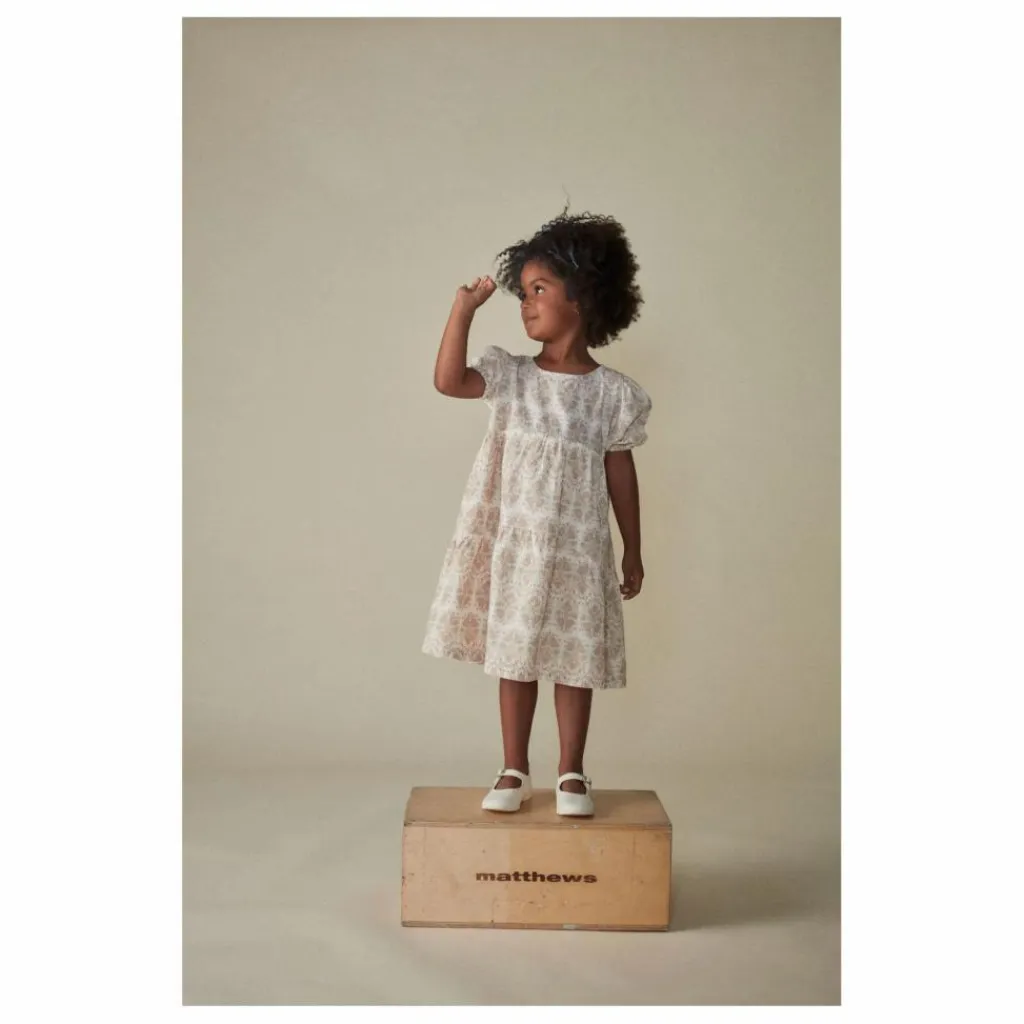 - Robe en papier peint à motifs floraux. Encolure ronde, manches bouffantes, décolleté avec détails froncés et fermeture à boutons dans le dos.