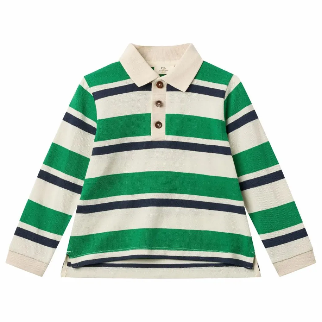 - Ce polo rayé est doté de manches longues et d’une fermeture à bouton sur la poitrine. Le polo est fabriqué en 100 % coton biologique, ce qui garantit le confort de l’enfant qui le porte.