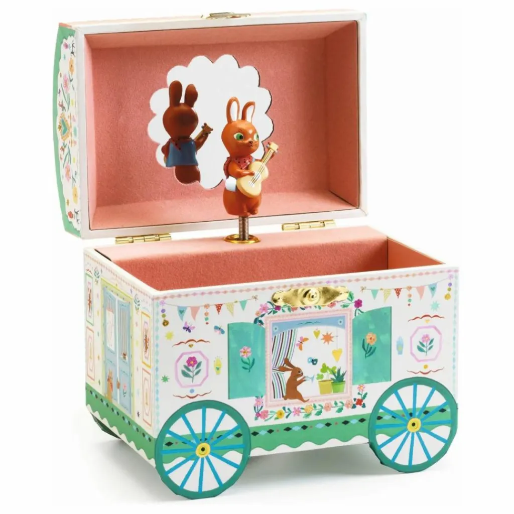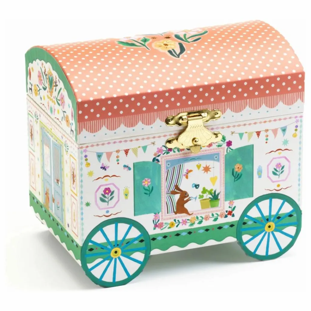 - Roulotte enchantée est une boîte à musique en forme de roulotte joliment illustrée pour ranger ses bijoux et secrets. Tournez la manivelle, ouvrez la boîte, et surprise ! Un lapin finement sculpté tourne et se reflète sur un miroir silhouetté au son de la musique « Le temps des cerises » d’Antoine Ronzon.