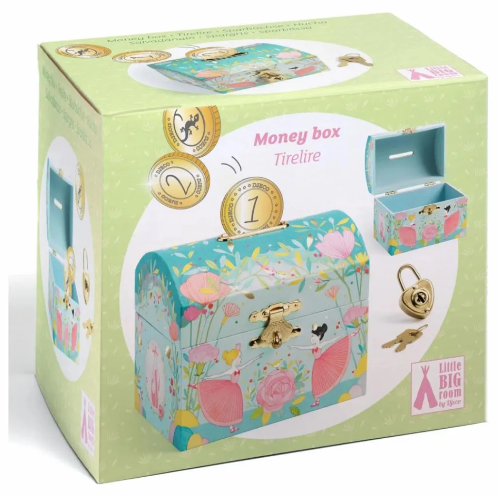 Un joli objet de décoration, avec ses illustrations bucoliques de ballerines, qui trouvera sa place dans la chambre. Fermée d’un cadenas, la tirelire est fournie avec 2 clés pour pouvoir récupérer ses économies.