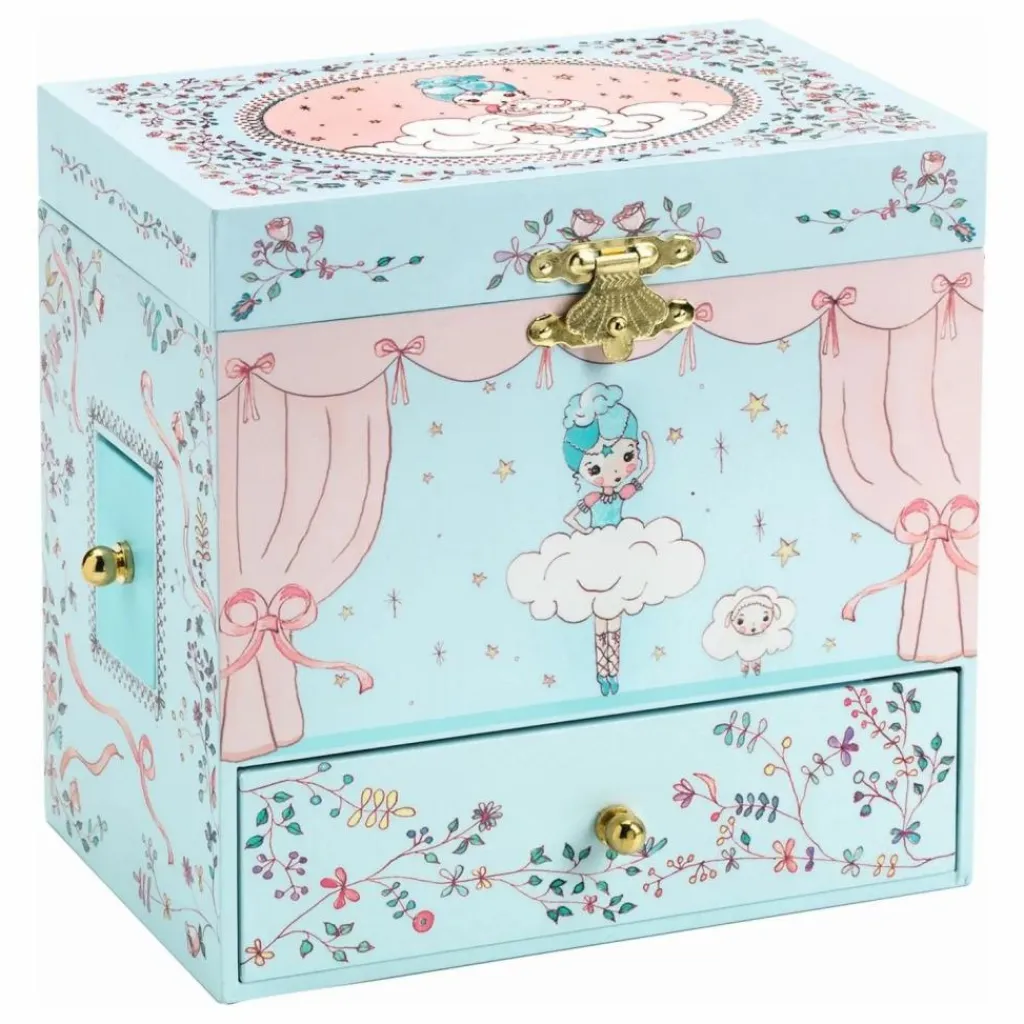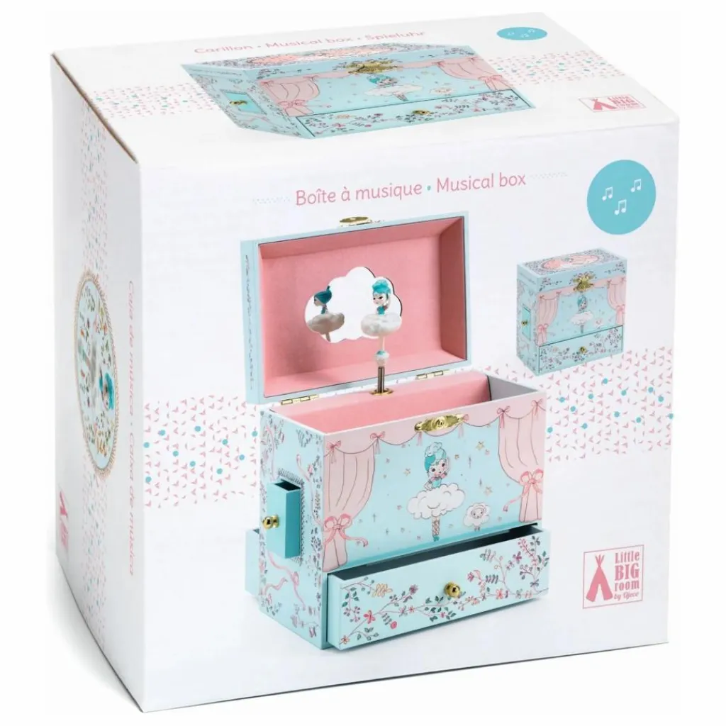 - Ballerine en scène est une boîte à musique joliment illustrée avec quatre tiroirs pour ranger ses bijoux et secrets. Tournez la clé, ouvrez la boîte et tout s’anime ! Une jolie figurine finement sculptée tourne et se reflète sur un miroir silhouetté au son de la musique «La flûte enchantée» de Mozart.