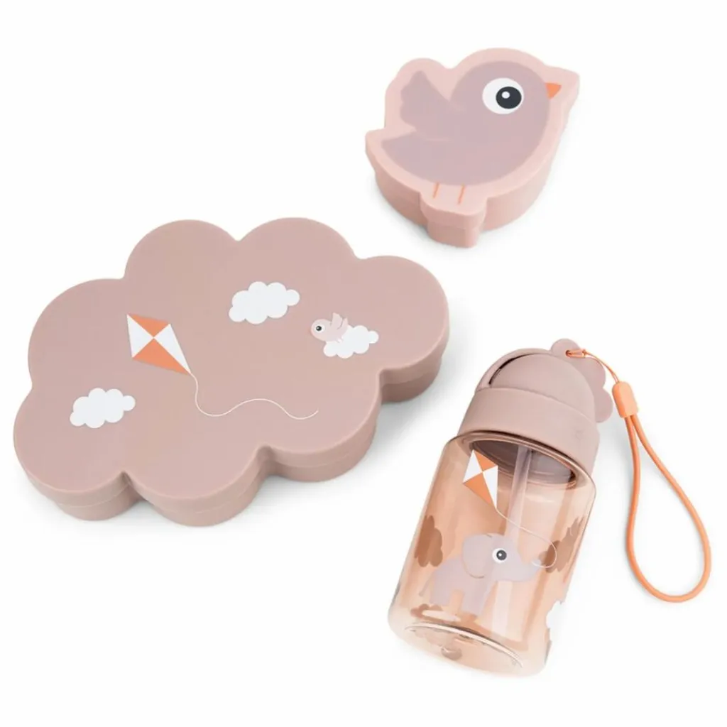 - • Ce coffret rose comprend une gourde à paille, une boîte à goûter et une lunch box
