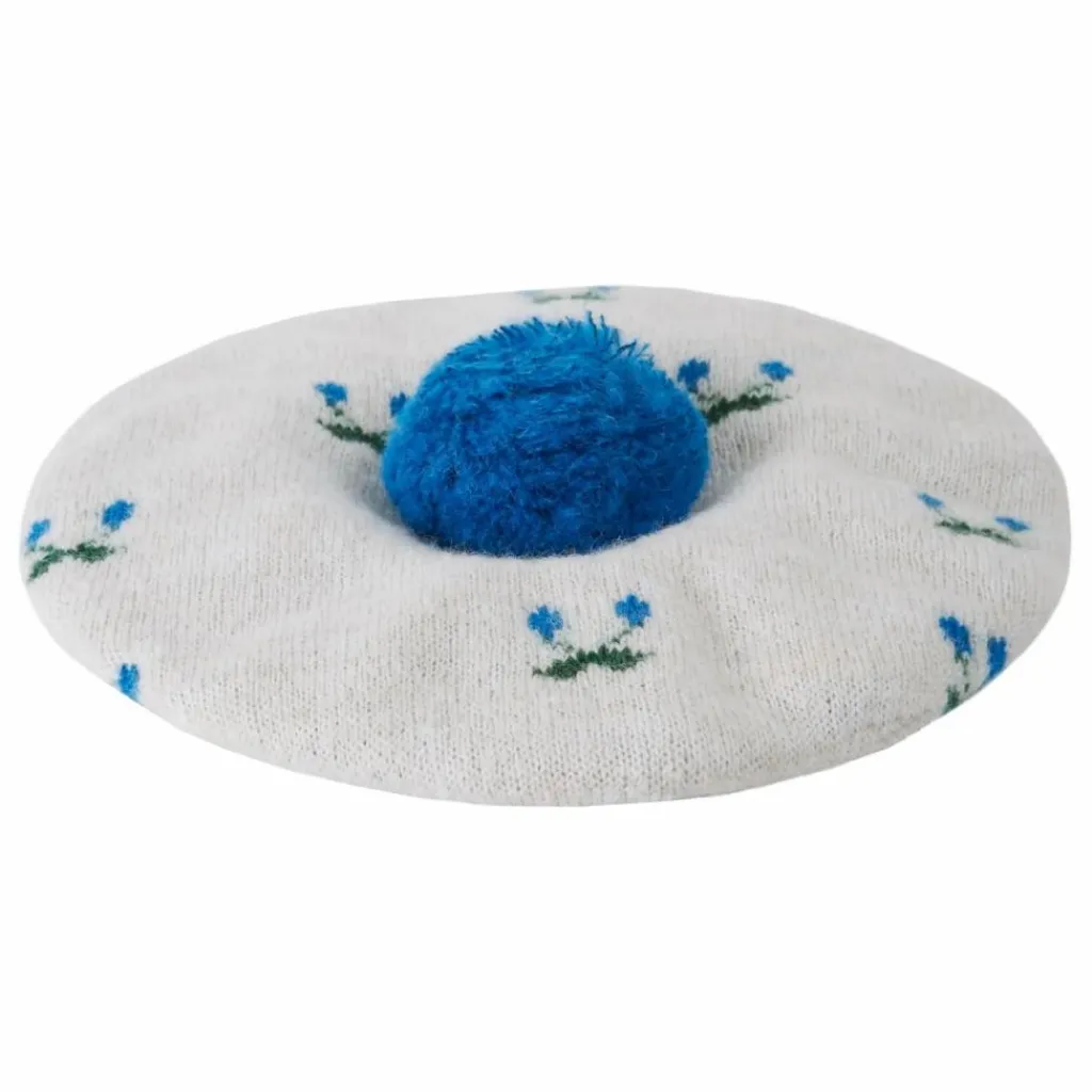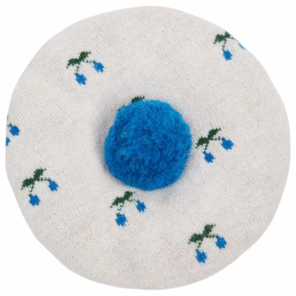 - Béret en laine mélangée à des fibres synthétiques tricotéses en maille jersey. Des cerises sont intégrées au tricotage avec la technique de Monsieur Jacquard et un gros pompon orne le centre du béret. La base est élastiquée et tient bien sur la tête.
