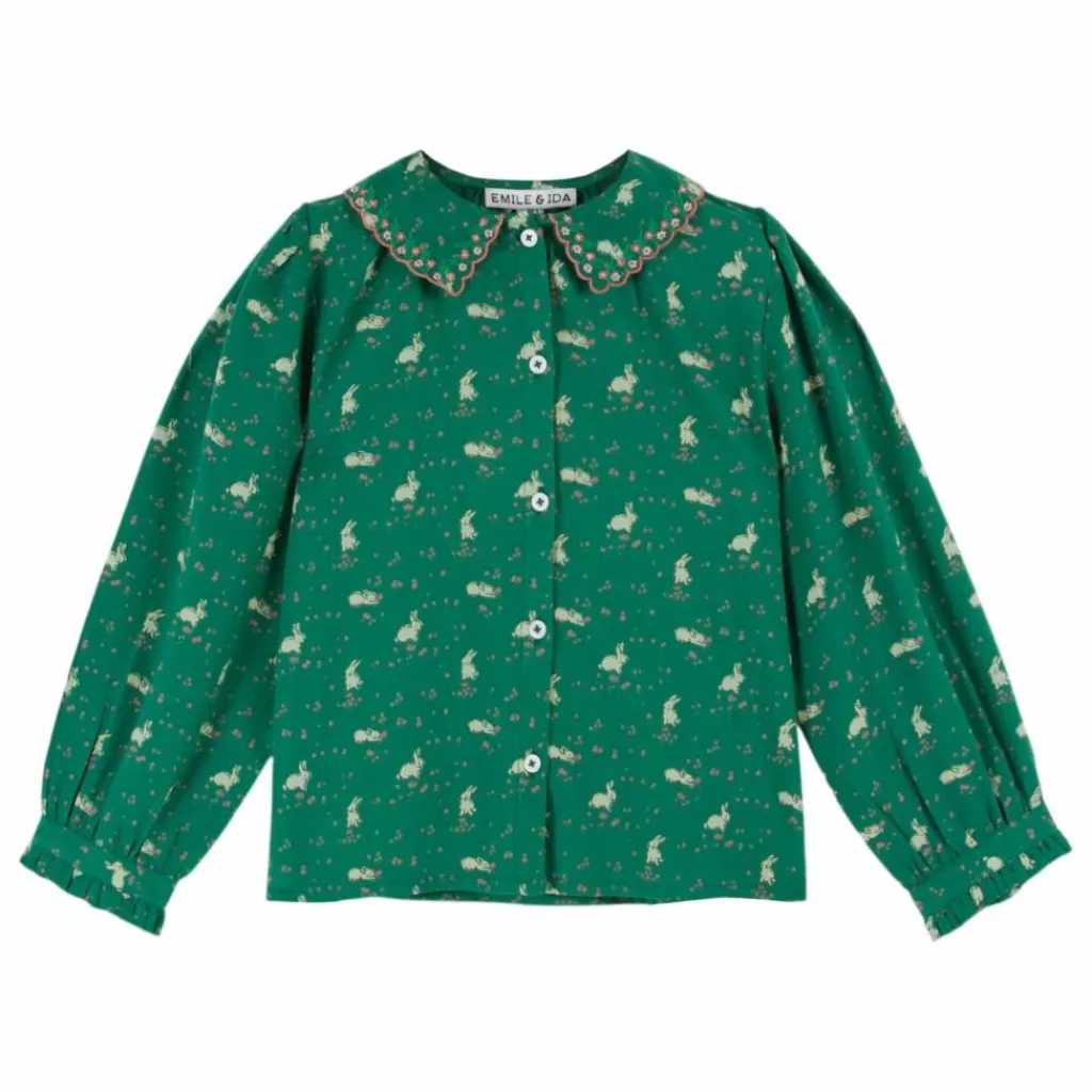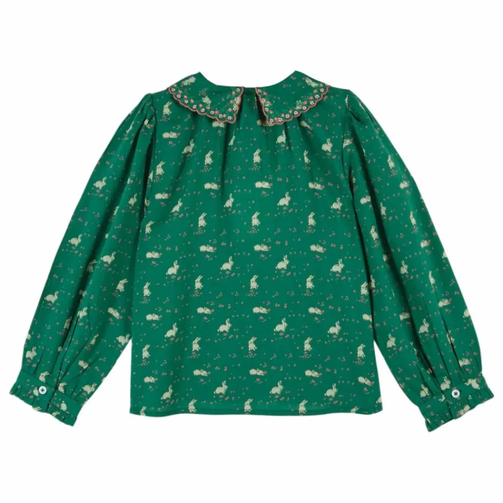- Blouse en coton vert où se promènent de petits lapins blancs.
