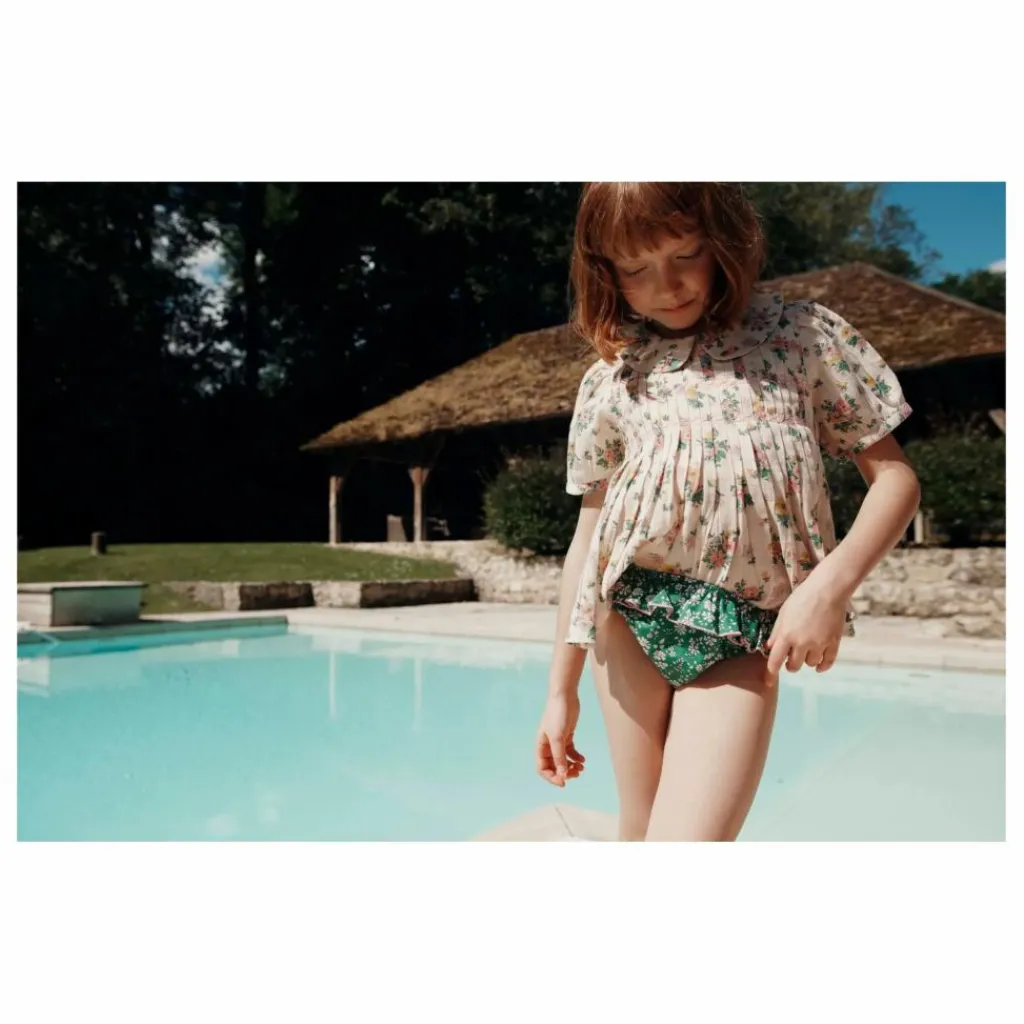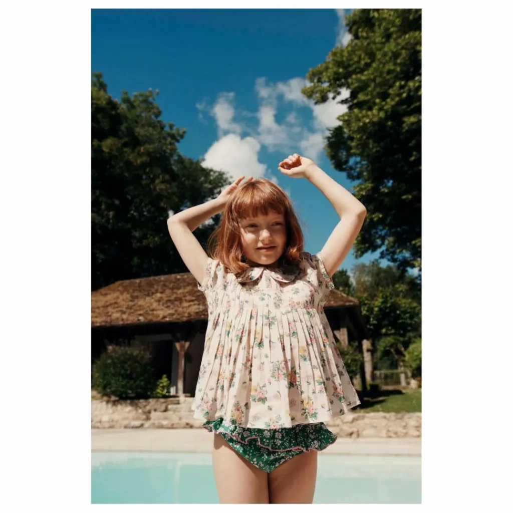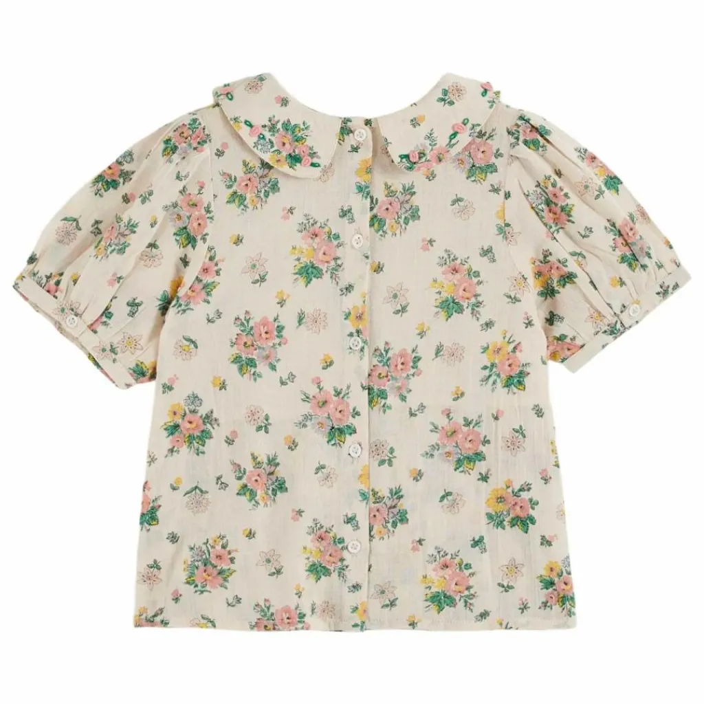 - Blouse en coton écru sur lequel des bouquets de fleurs dans des tons pastel, comme dans un jardin anglais, s’épanouissent.
